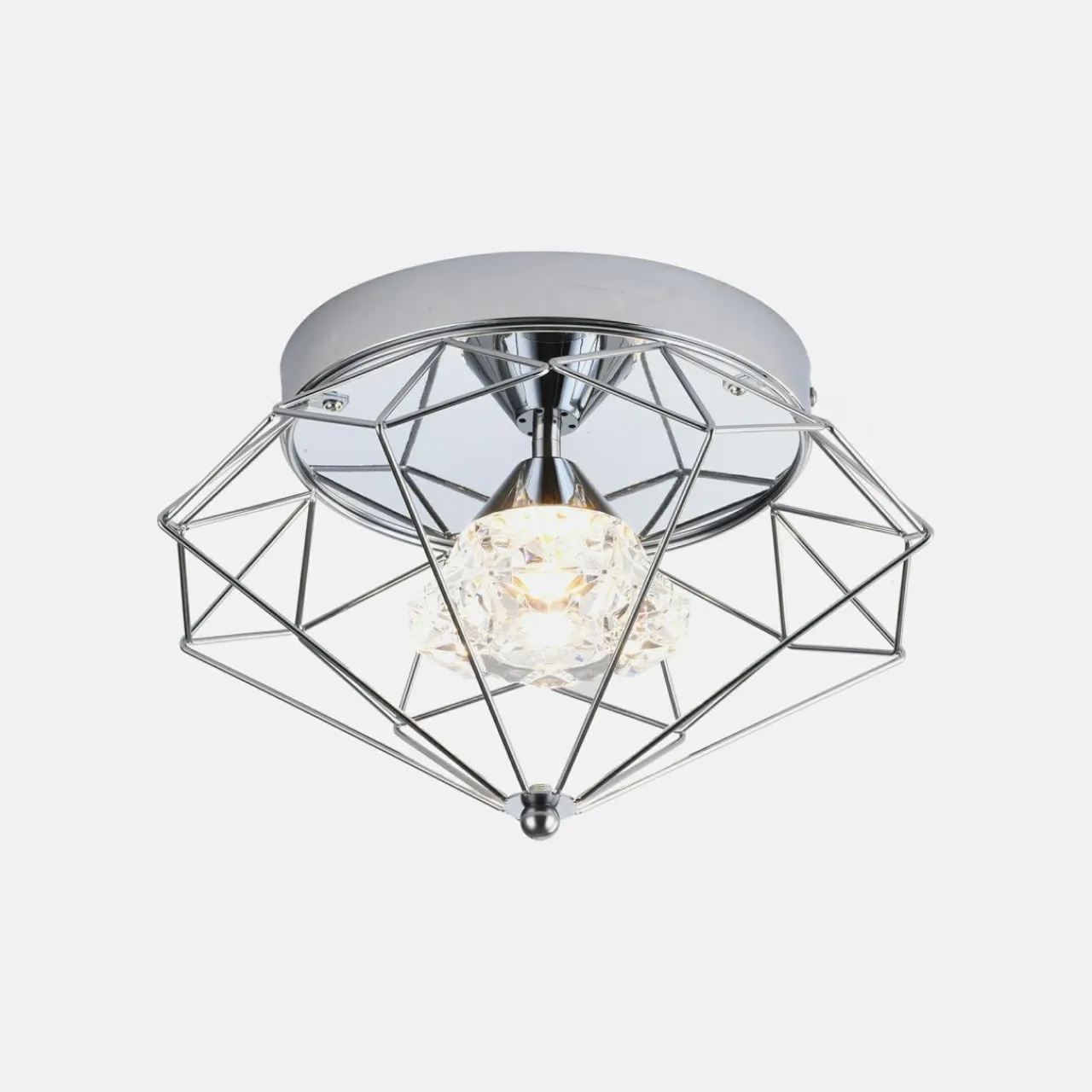 - Lampa sufitowa AMY posiada błyszczącą chromem podstawę i klosz.