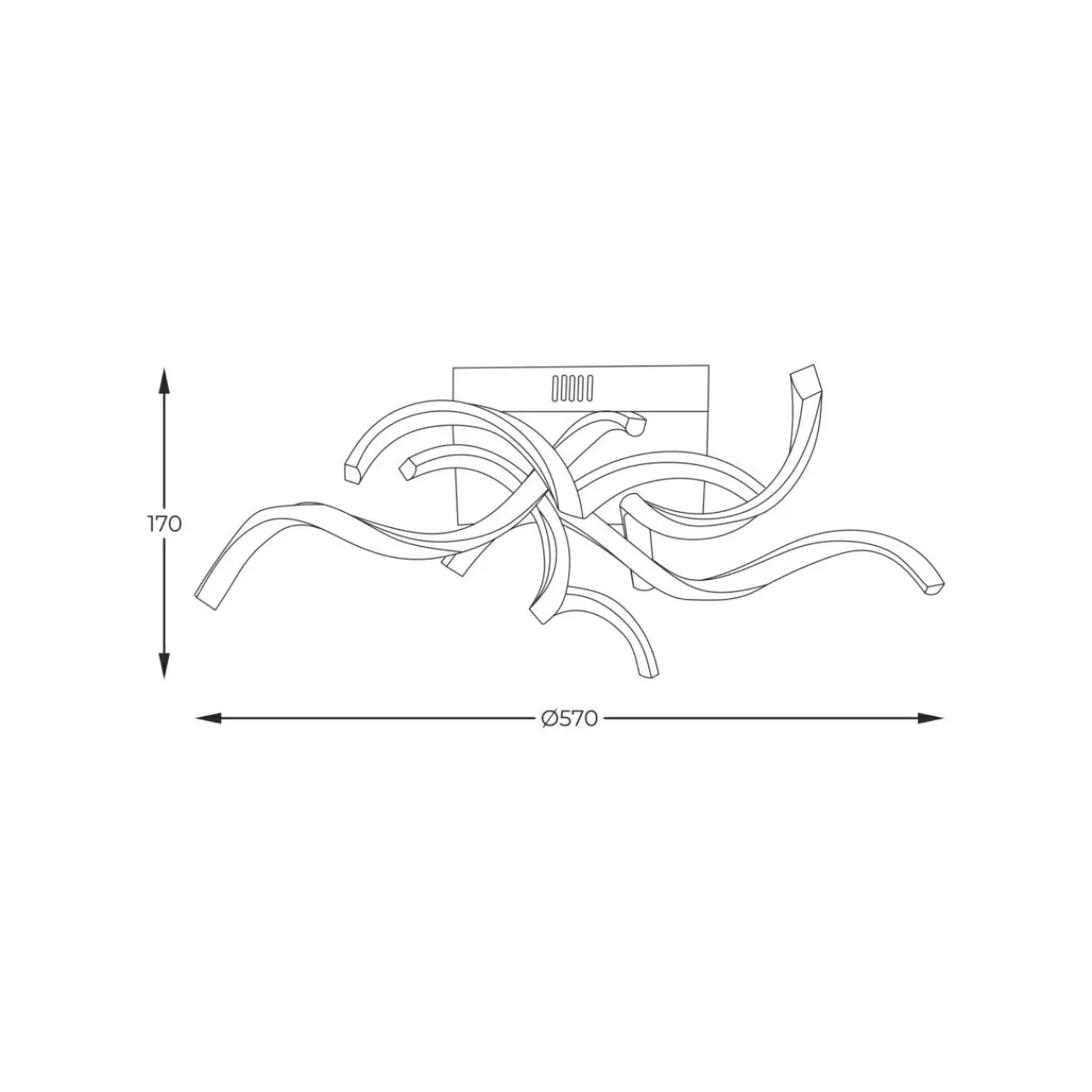 - Kształt lampy przywodzi na myśl szereg wstęg wirujących wokół geometrycznej, kwadratowej podsufitki.