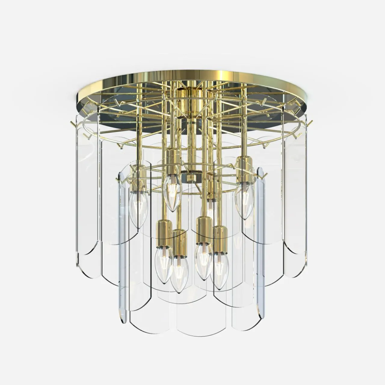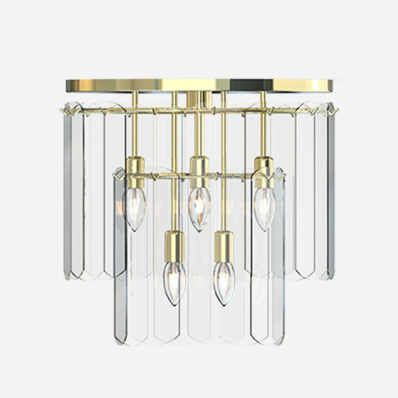 - Modny kształt lampy oparty jest ozdobach o regularnym kształcie, wykonanych ze szkła. Wykończenie lampy łączy złoto oprawy z transparentnym kloszem, wewnątrz którego doskonale widać kształty żarówek.