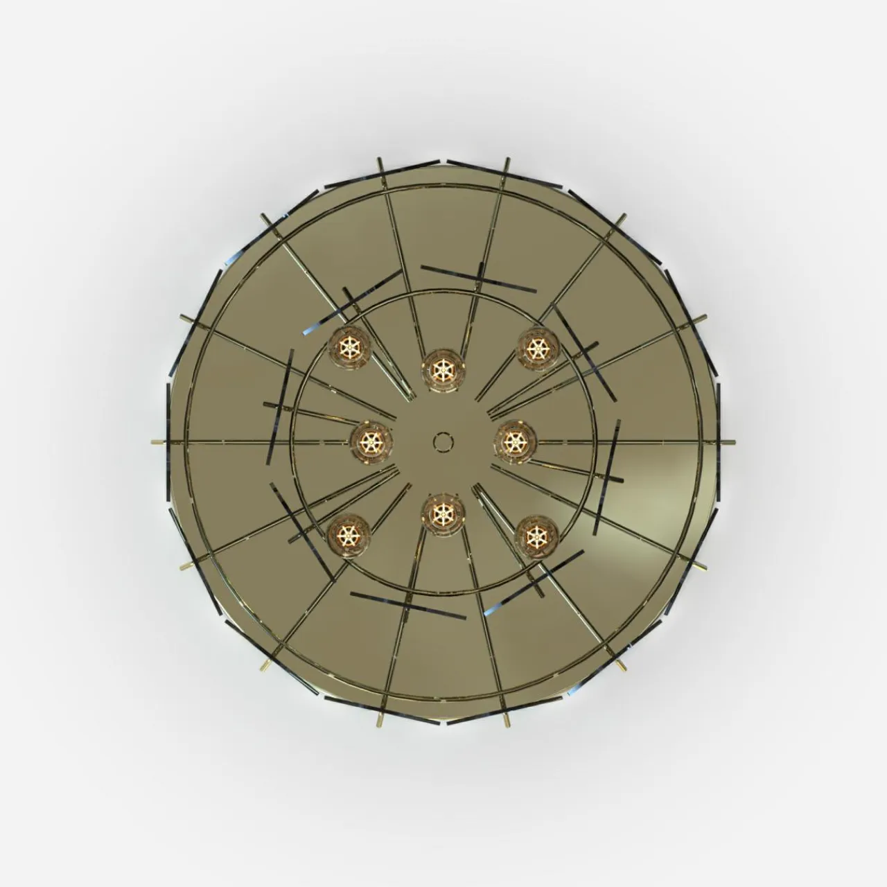 - Lampa posiada okrągłą podstawę i stelaż w złotym kolorze. Jej średnica to 43 cm, w sam raz, by rozświetlić wnętrze pokoju dziennego, przestronnej sypialni lub jadalni.