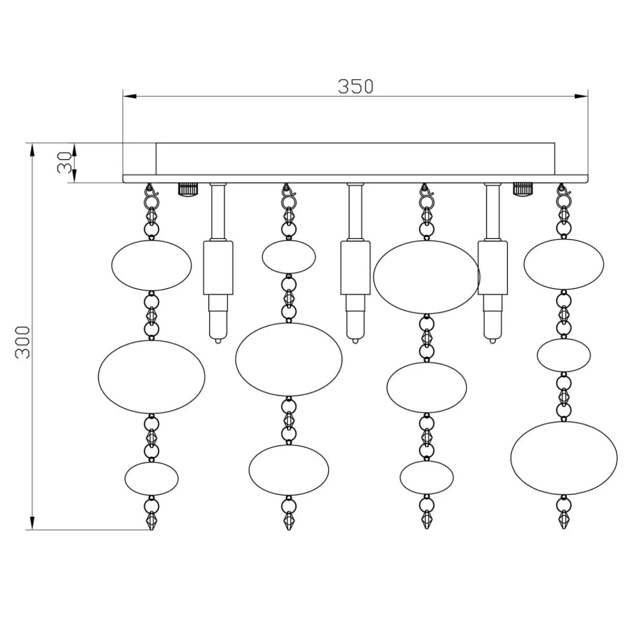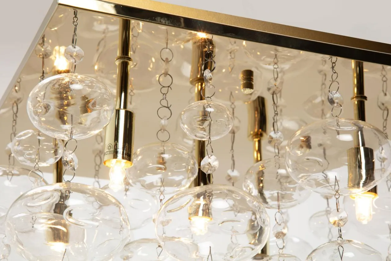 Kwadratowa podstawa lampy została wykonana z metalu ozdobionego wykończeniem w kolorze złota. Bezpośrednio pod nią zawieszone są elementy dekoracyjne o nieregularnym kształcie. Po zapaleniu światła pojawia się dodatkowy efekt w postaci malowniczych refleksów na ścianach oraz suficie.