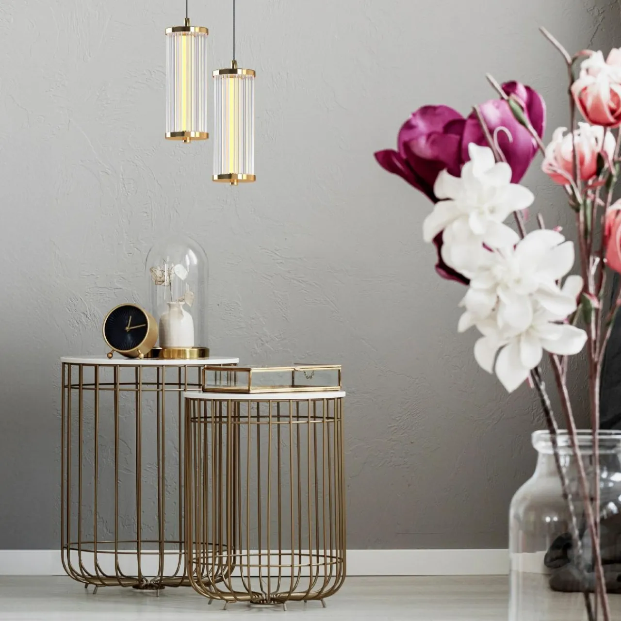 Urządź salon w nowoczesnym stylu – wybierz do salonu pojedynczą lub potrójną lampę wiszącą oraz kinkiet z tej kolekcji.