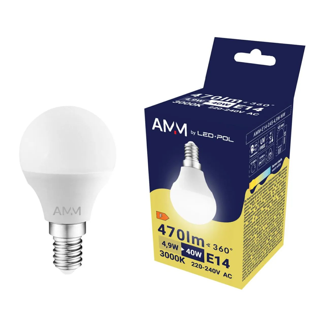 Żarówka AMM-E14-G45-4,9W-WW emituje światło o ciepłej barwie – 3000K i strumieniu 470 lumenów.