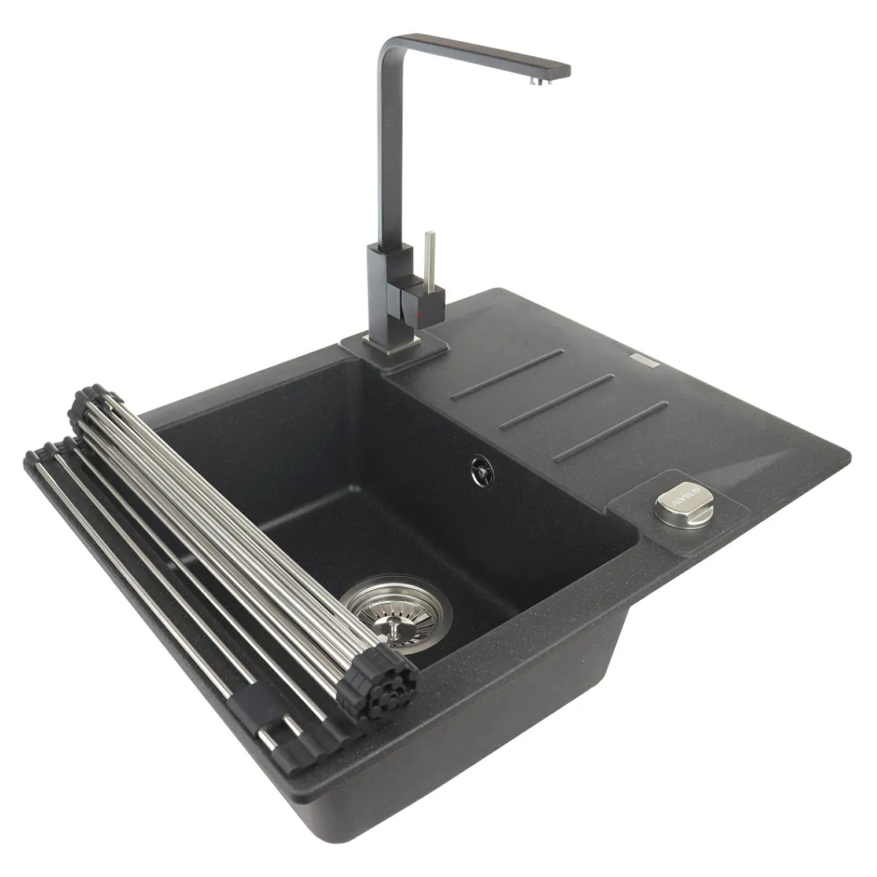 - Wykończony w czarnym kolorze posiada pojedynczą komorę i ociekacz.