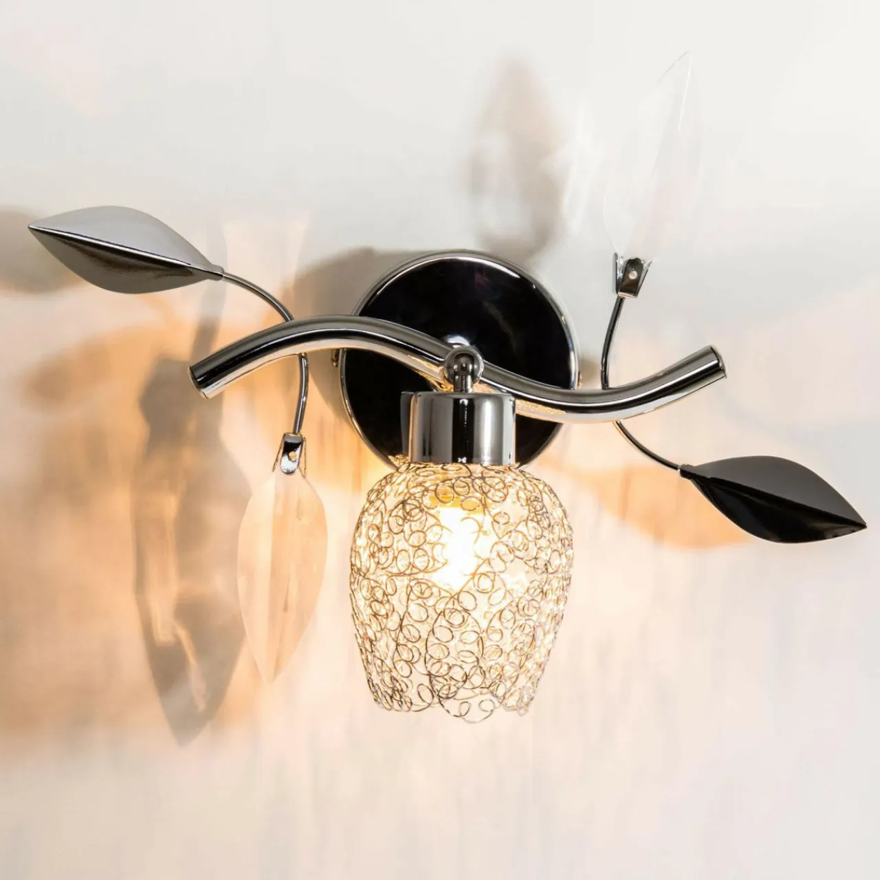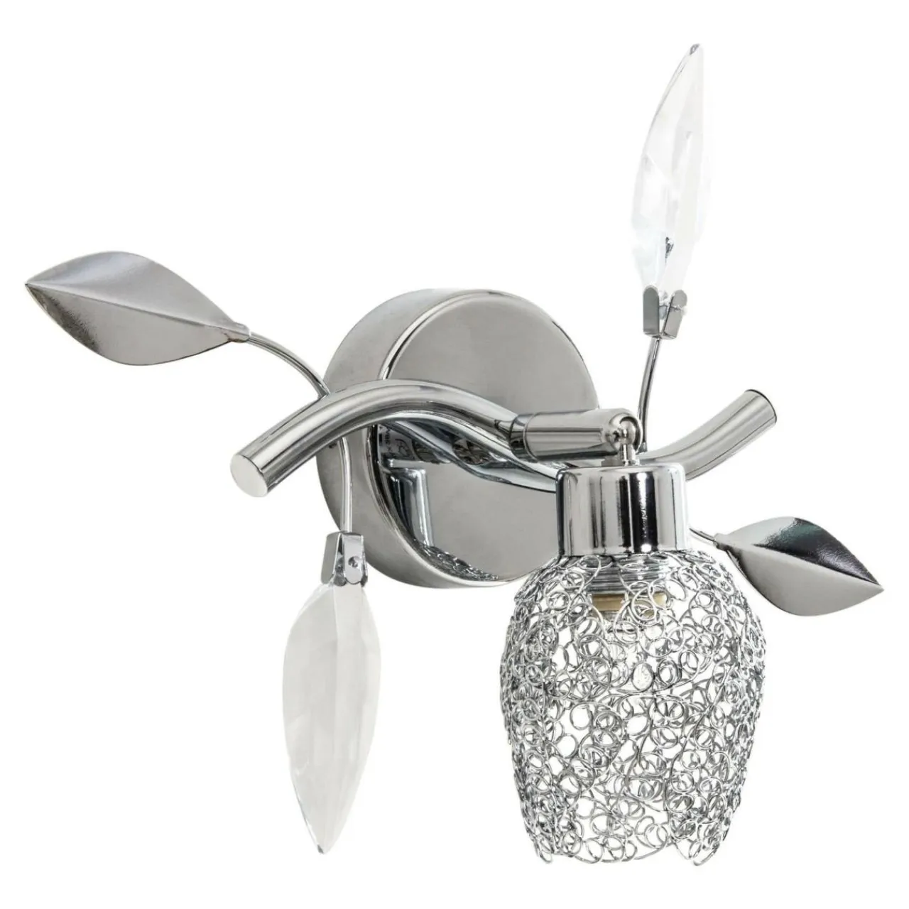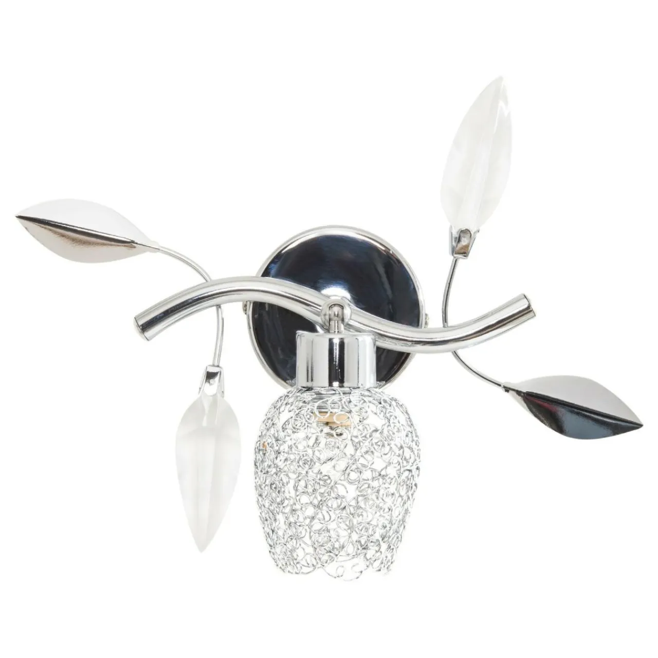 Kinkiet posiada metalową, wykończoną chromem podstawę zdobioną charakterystycznym motywem roślinnym. Całość zdobi klosz z akrylu w kształcie kwiatu o rozchylonych płatkach. Jego ozdobny charakter sprawia, że świetnie wygląda w połączeniu z klasycznymi wnętrzami utrzymanymi w jasnej kolorystyce.