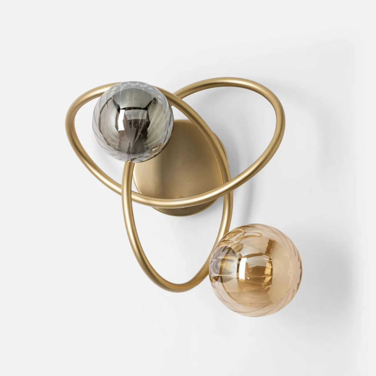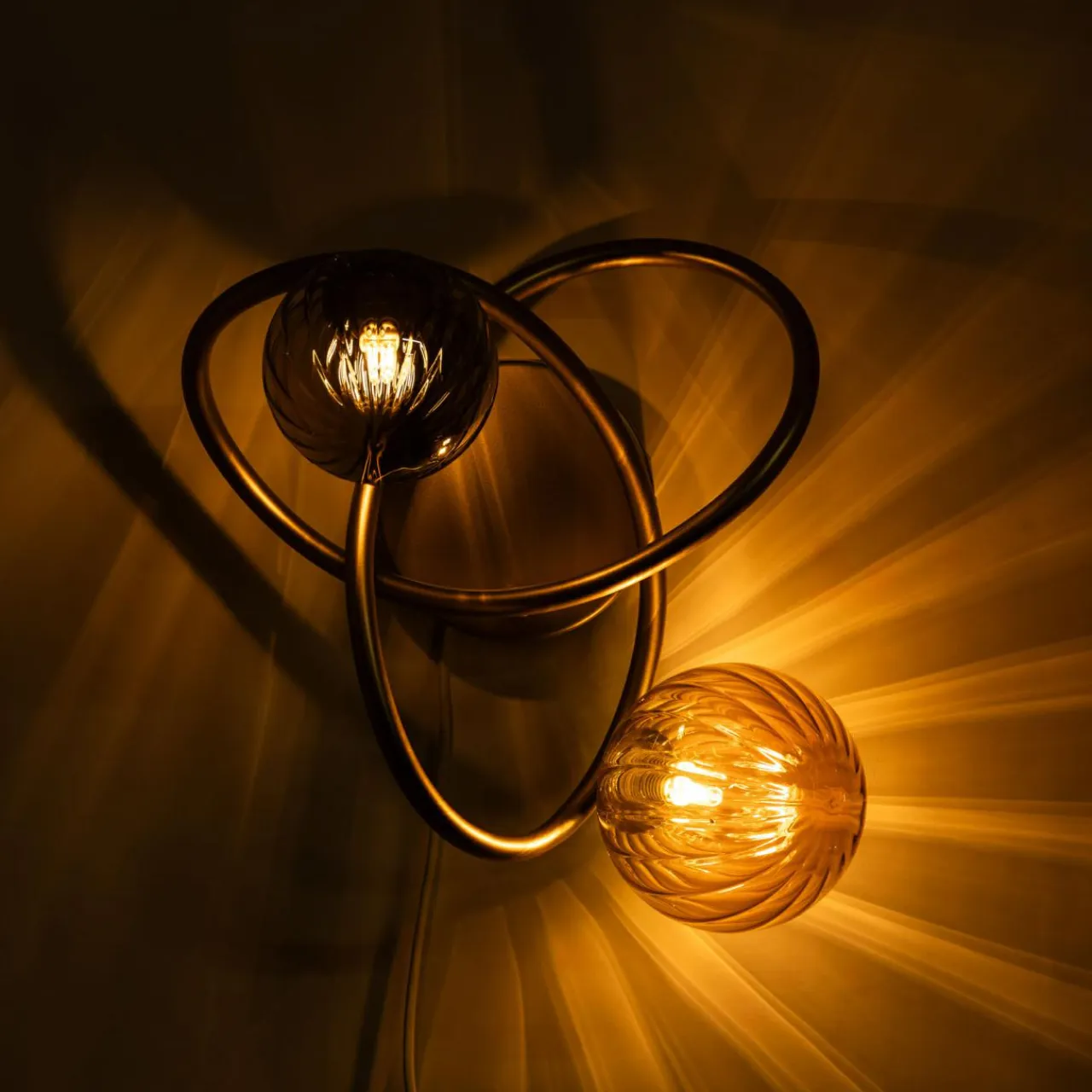 Wyróżnia go eleganckie, połyskujące wykończenie w złotym kolorze, jednak to dobór odcienia szkła w kulistych kloszach zwraca największą uwagę.