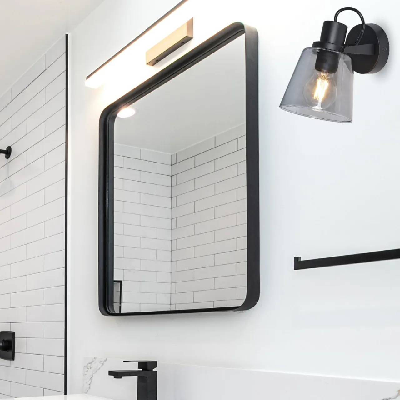 - Klosz lampy ma możliwość regulacji – pozwala ustawić światła, by jak najlepiej dopasować oświetlenie do wnętrza łazienki – przydaje się zwłaszcza, gdy lampa zawieszona jest nad lustrem.