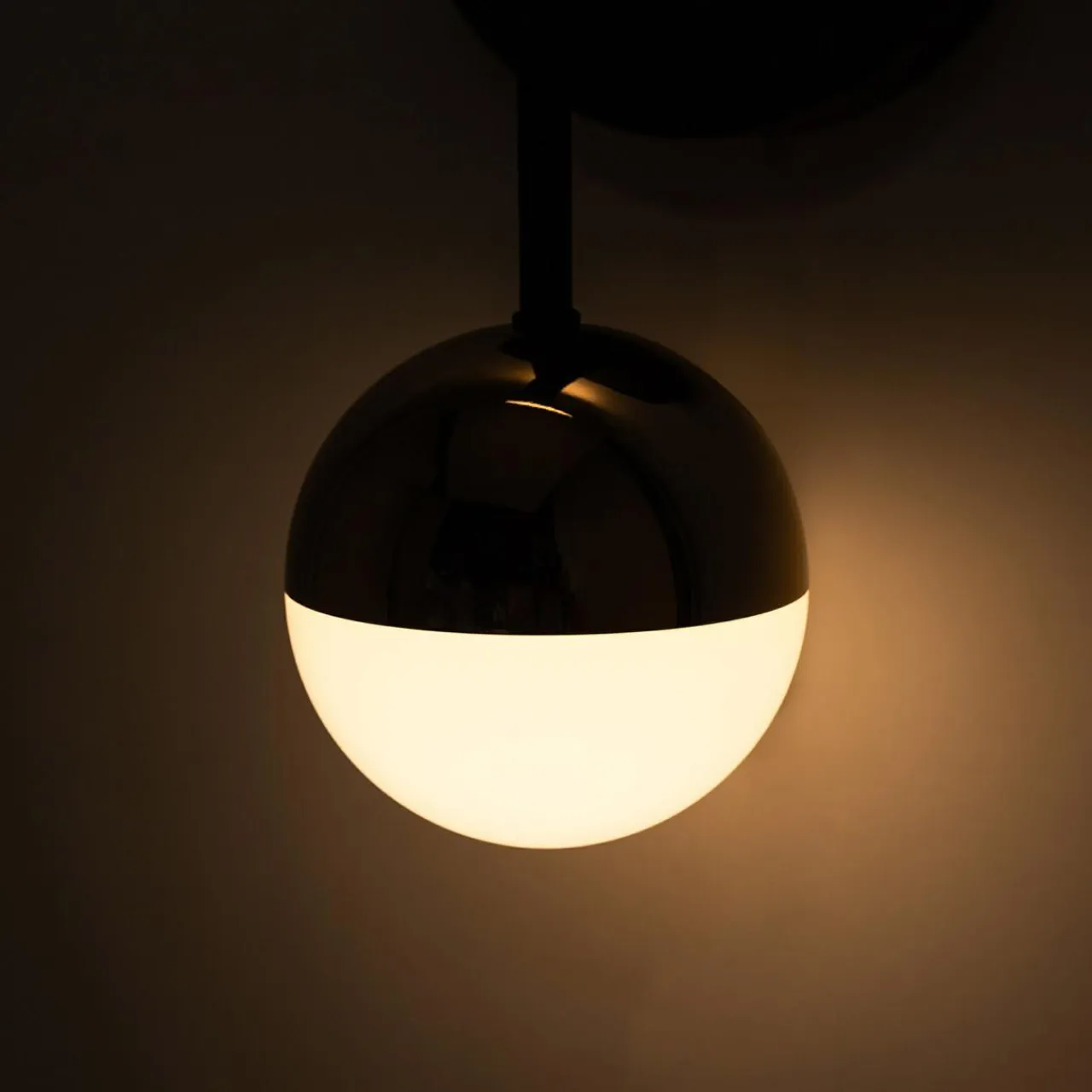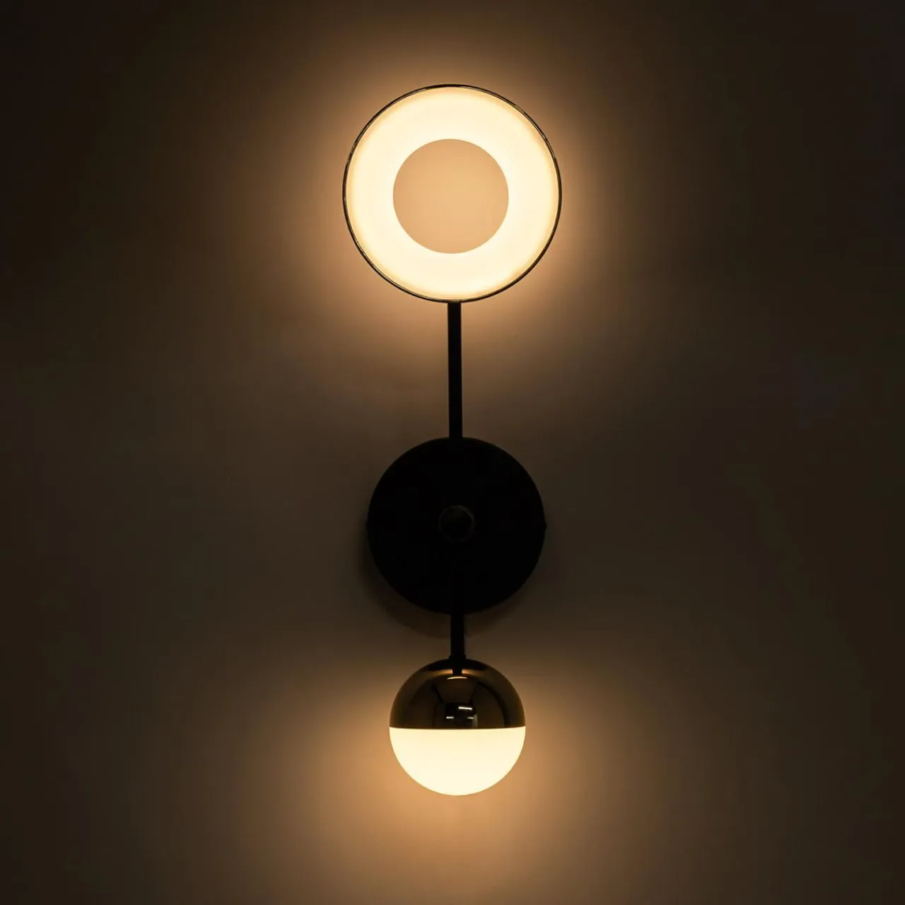 - Elementy dekoracyjne lampy w postaci podświetlonego okręgu oraz kuli zmiękczają wizualnie geometryczny design i wzbogacają nowoczesną estetykę lampy.