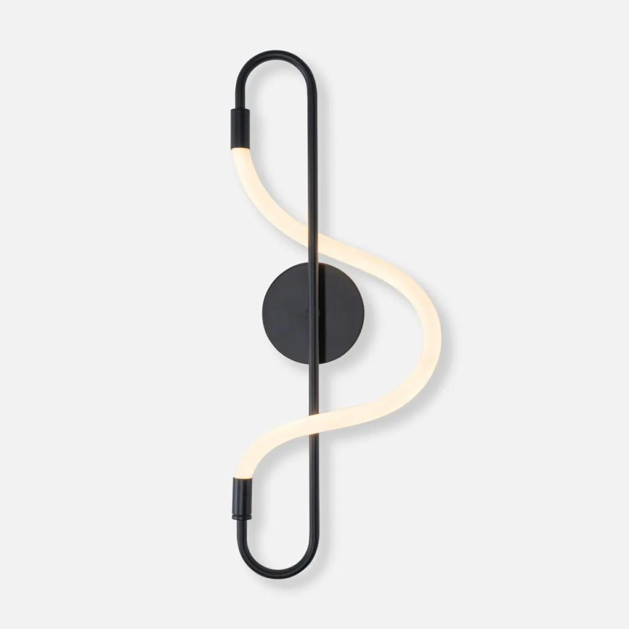 - Podstawa kinkietu ze sztywnym ramieniem i wijącą się na kształt „klucza wiolinowego” LED-ową wstęgą to ciekawy pomysł, który uświetni wygląd wnętrza.
