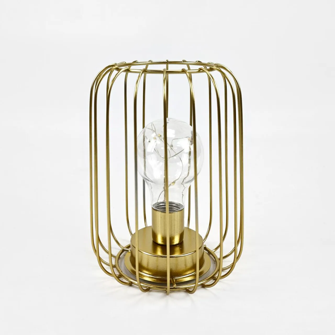 - Klosz lampy ze starannie plecionych, wykończonych na złoty kolor drucików został ustawiony na płaskiej, okrągłej podstawie.