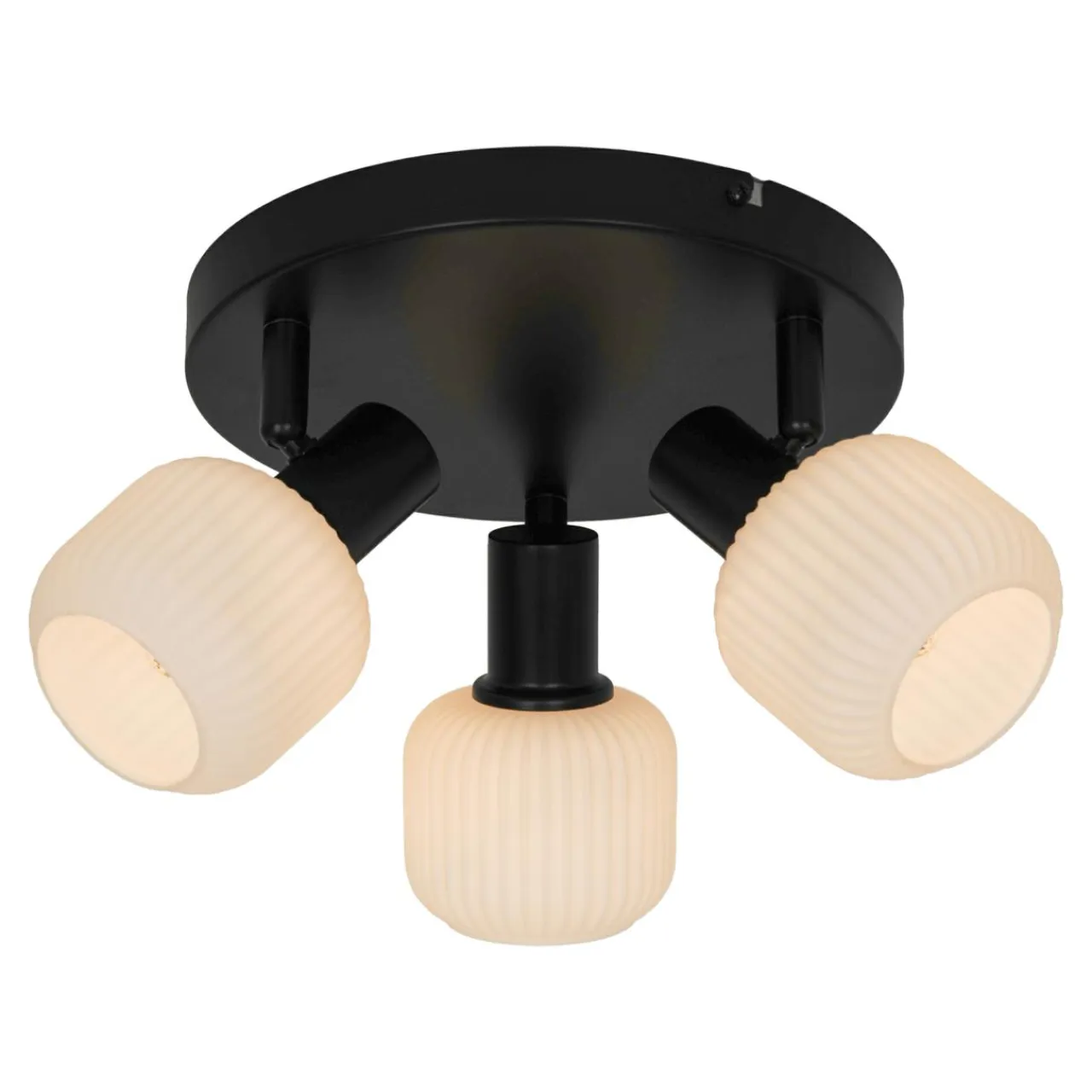 - 3 białe, mleczne klosze ładnie kontrastują z czarną, matową oprawą podstawy. Do zawieszenia w jasnym, chłodnym wnętrzu oraz w ciepłych pastelowych kolorach otoczenia.