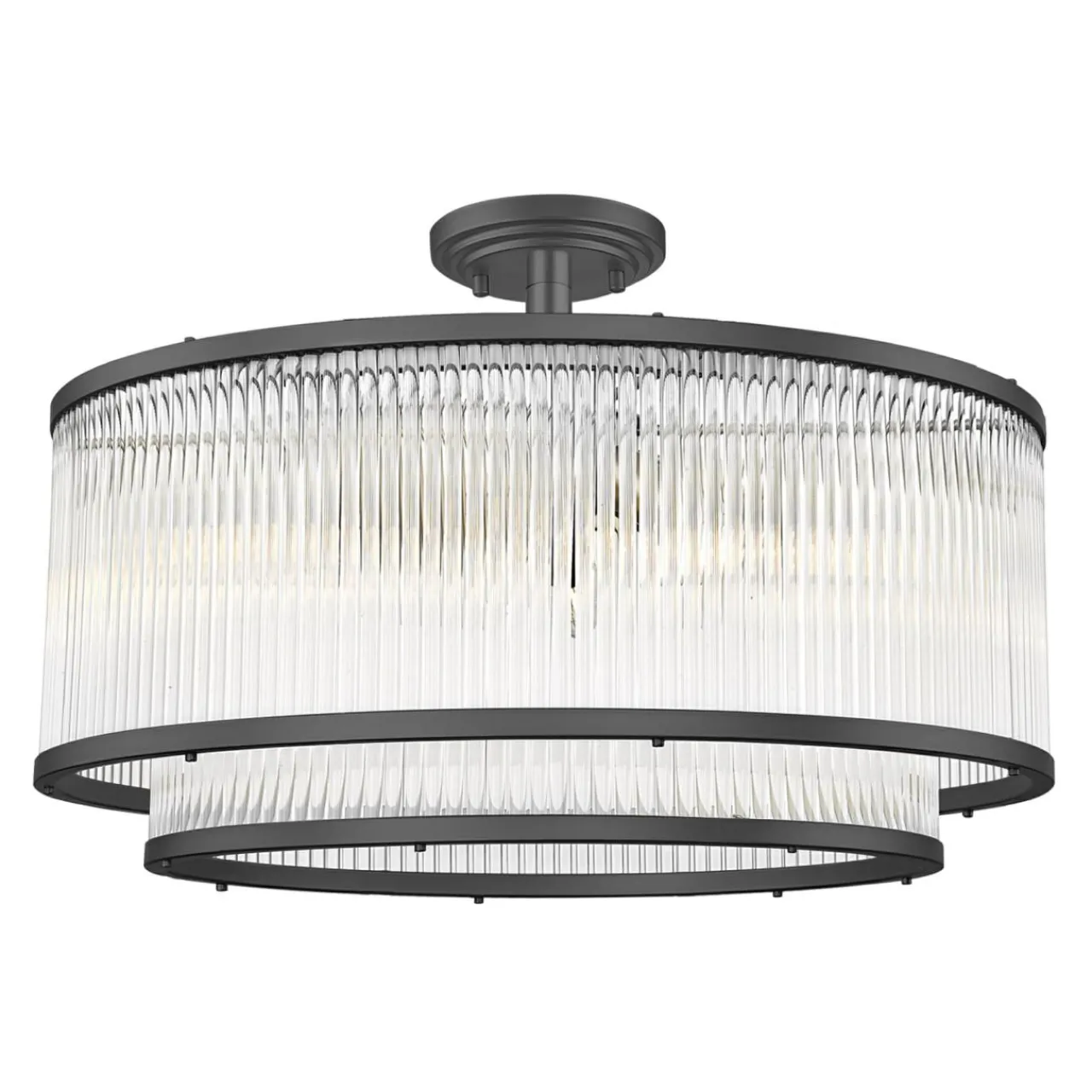 - Podwójny szklany klosz podkreślony metalowymi obręczami i czarnym wykończeniem wspaniale komponuje się z chłodnymi, jasnymi kolorami wnętrza.