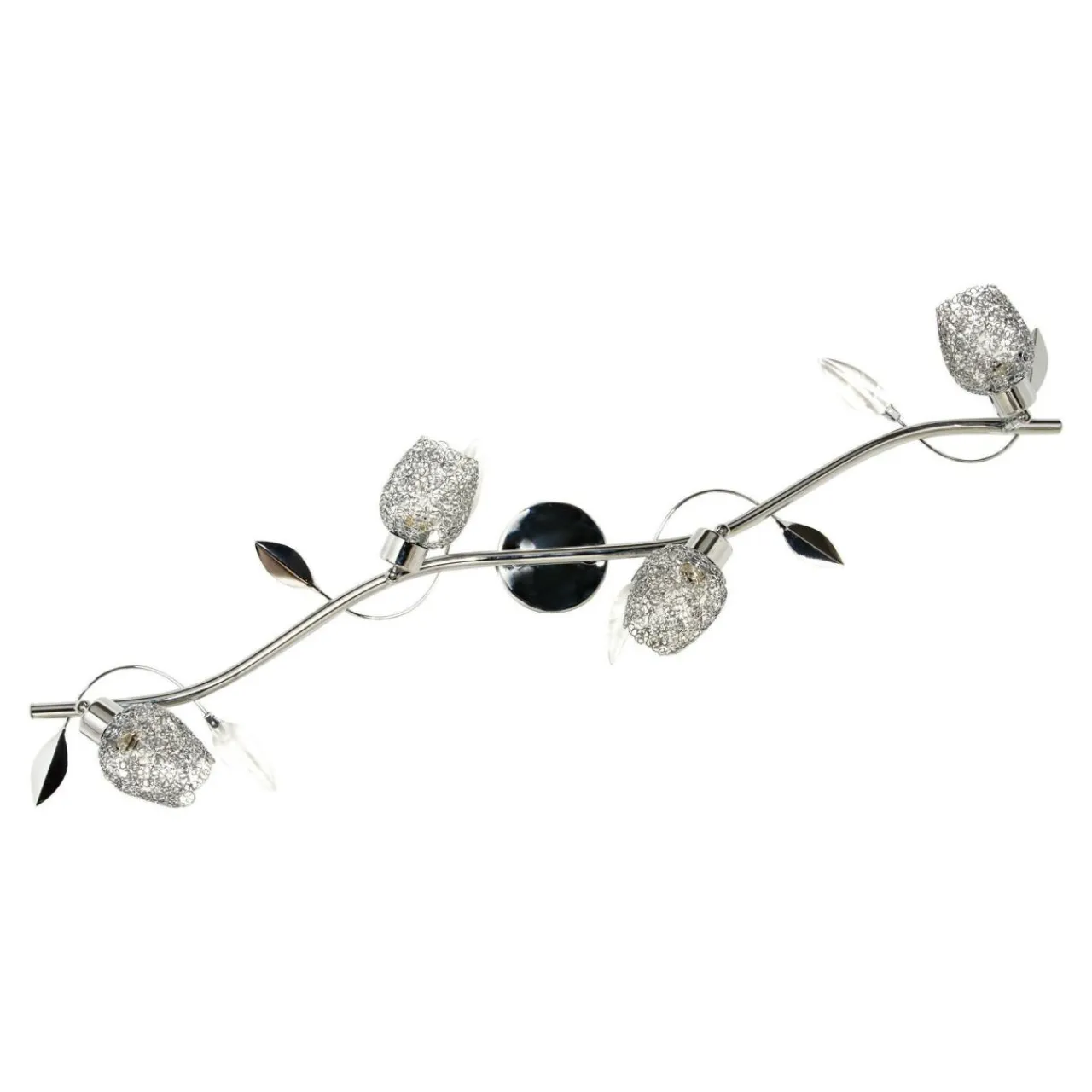 Posiada metalową, wykończoną chromem podstawę, zdobioną charakterystycznym motywem roślinnym. Całość zdobią cztery klosze z akrylu w kształcie kwiatów o rozchylonych płatkach. Jej ozdobny charakter sprawia, że świetnie wygląda w połączeniu z klasycznymi wnętrzami utrzymanymi w jasnej kolorystyce.