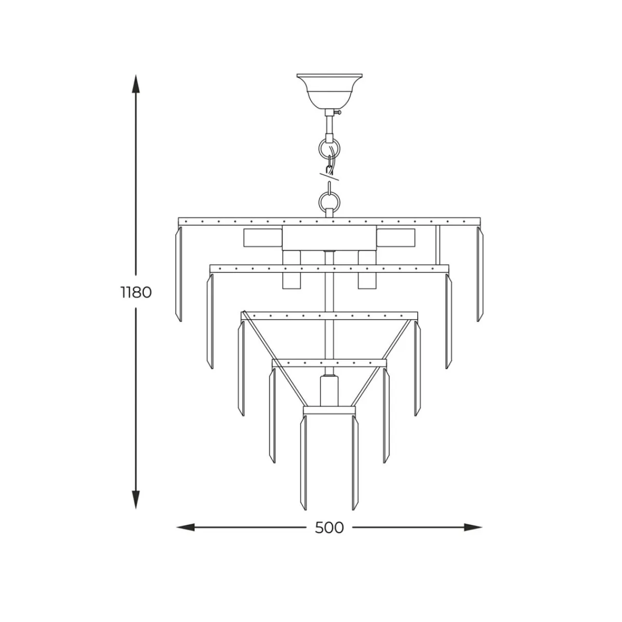 - Szklane kryształki zawieszone na metalowej podstawie są uformowane są w okręgach na wzór kaskady – od największego koła do najmniejszego.