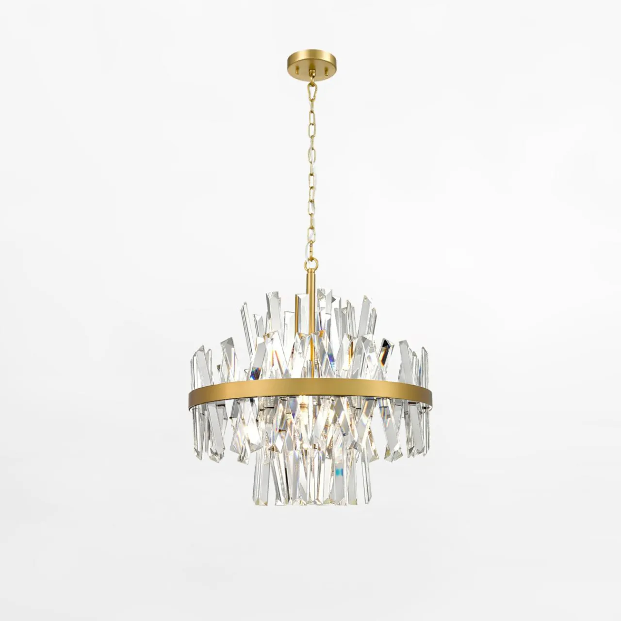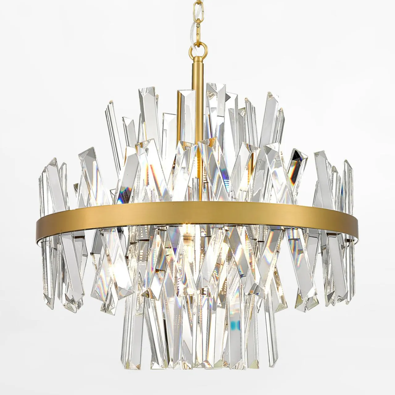 Połączenie szklanych, fantazyjnie ułożonych kryształów oraz elementów stelaża lampy w kolorze szczotkowanego złota sprawi, że wnętrze Twojego domu zalśni wewnętrznym blaskiem.