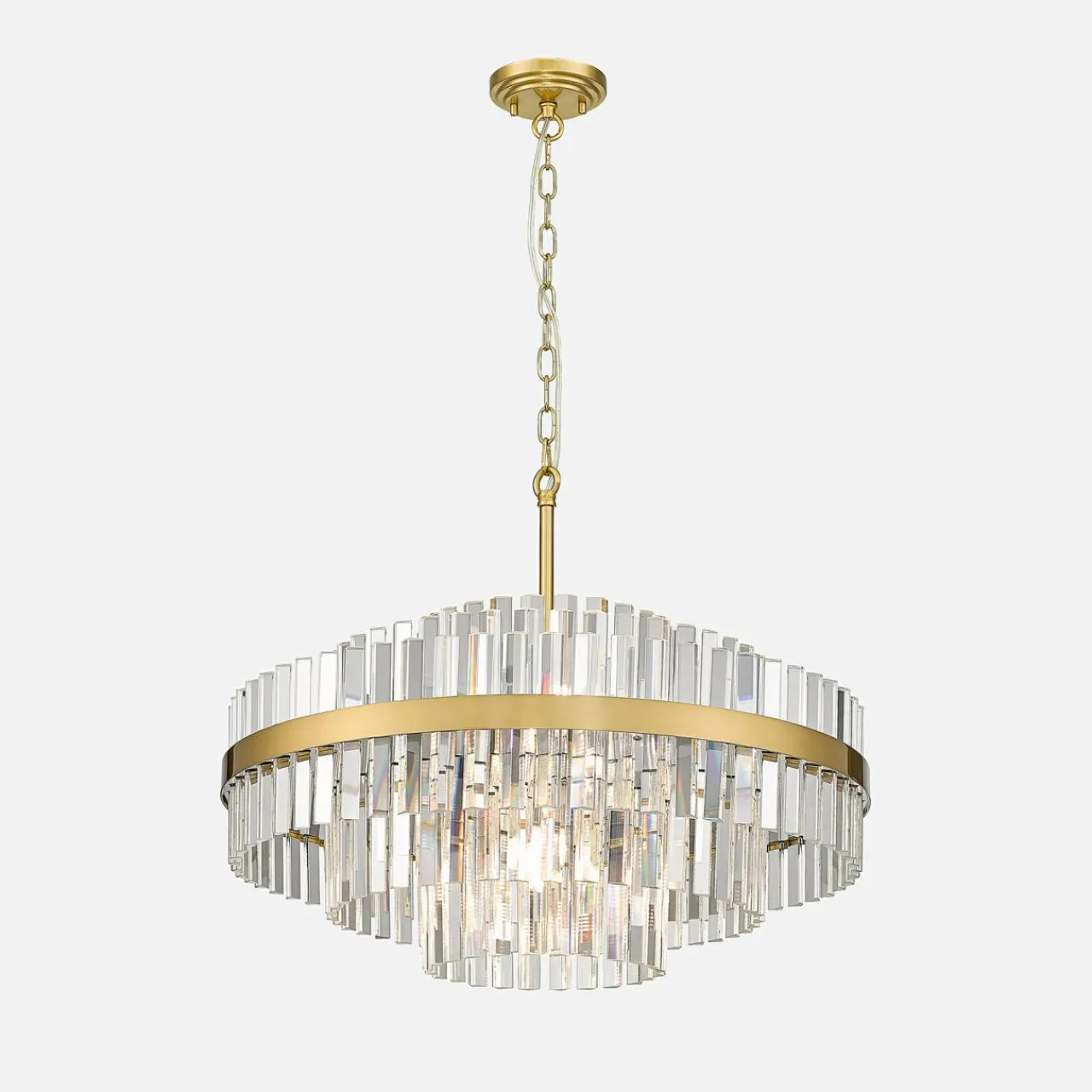 Połączenie szklanych, zawieszonych pionowo kryształów oraz elementów stelaża lampy w kolorze szczotkowanego złota sprawi, że pokój zalśni wewnętrznym blaskiem.