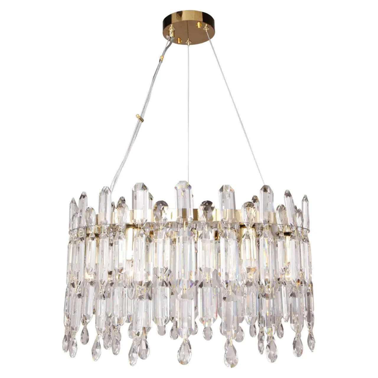 Elementy dekoracyjne lampy CROWN to ustawione w rzędach szklane kryształy połączone wykończonym na złoto łańcuszkiem – faktycznie wzór ten sprawia wrażenie korony.