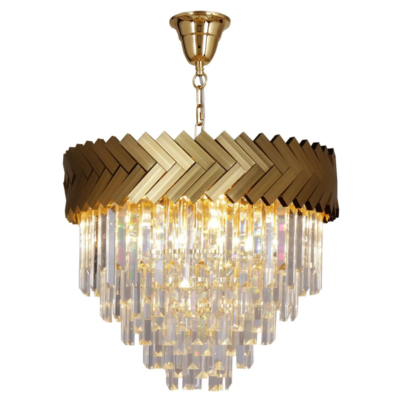 - 5 warstw szklanych ozdób zawieszonych na stelażu w złotym kolorze zostało ułożonych na wzór kaskady – od największego koła do najmniejszego.