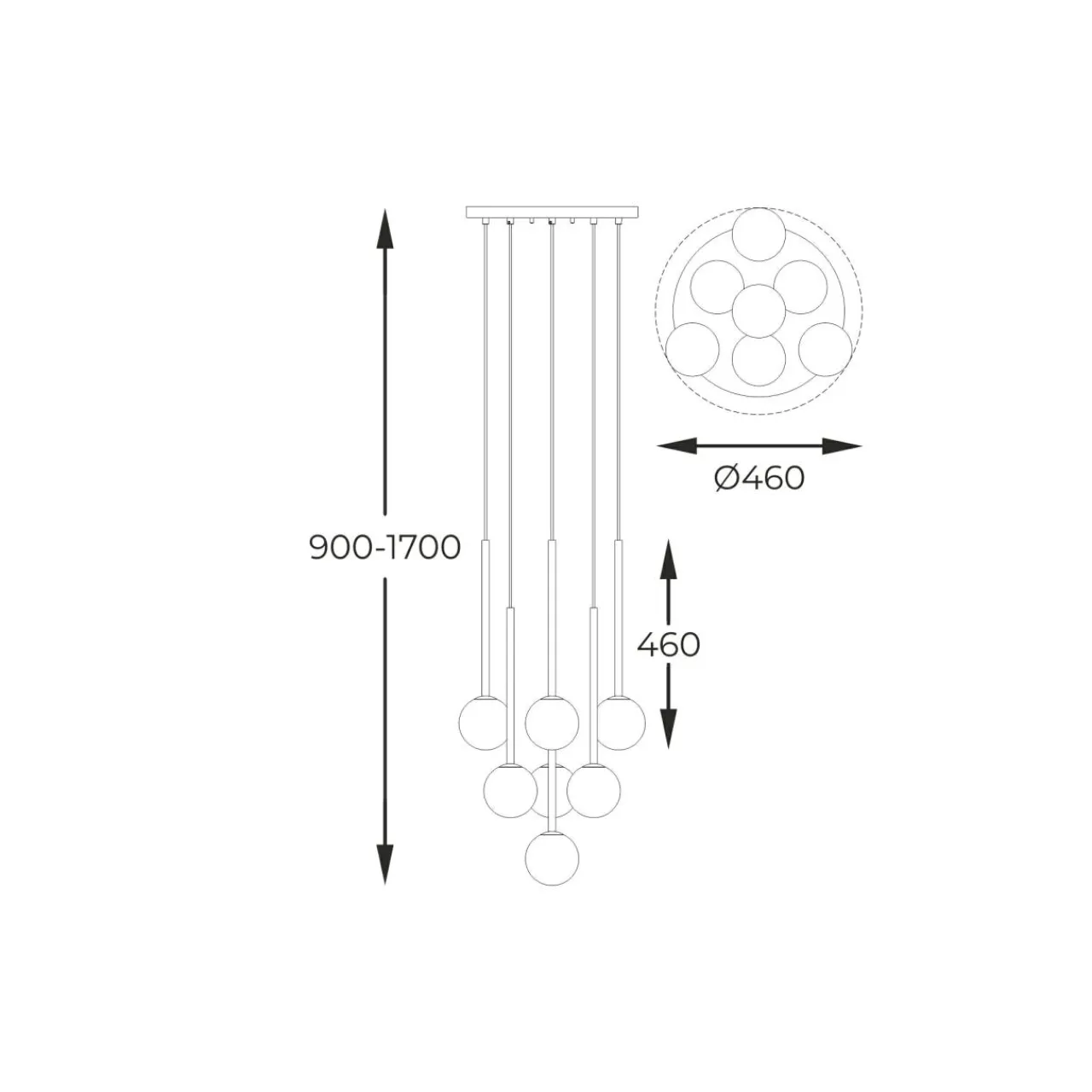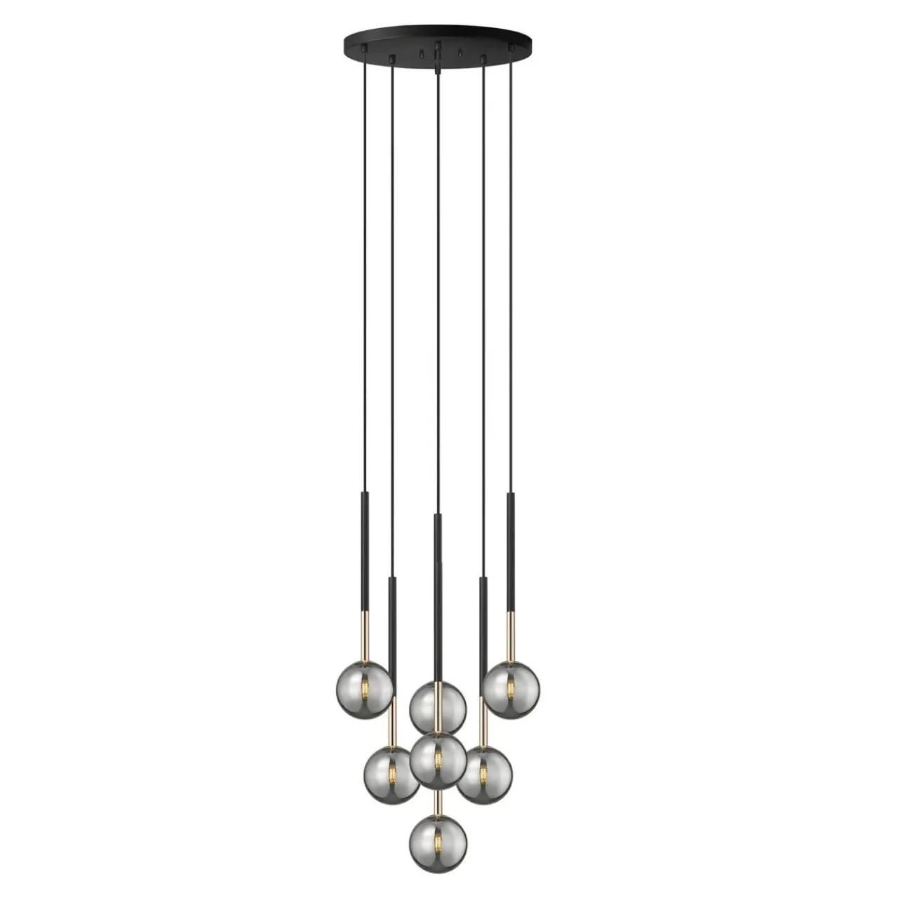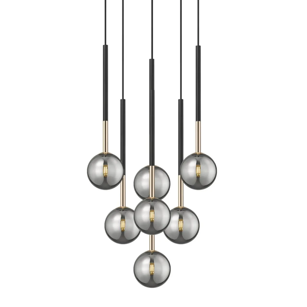 - Oprawa wykończona czarnym kolorem z ozdobnym dodatkiem francuskiego złota została dopełniona przez 7 transparentnych kloszy w odcieniu grafitu – to zestawienie dopasujesz do wnętrz, ciążących w stronę loftowej estetyki.