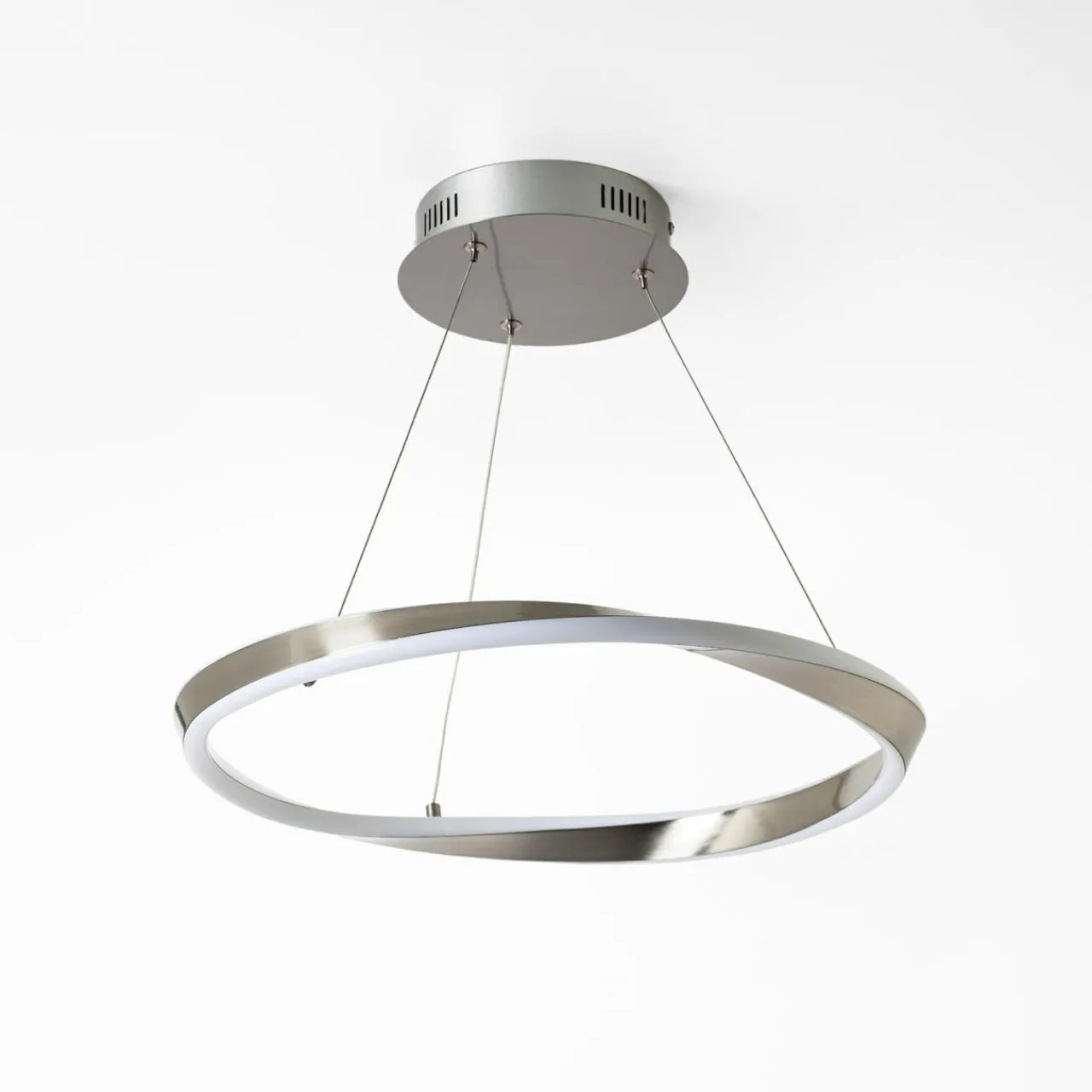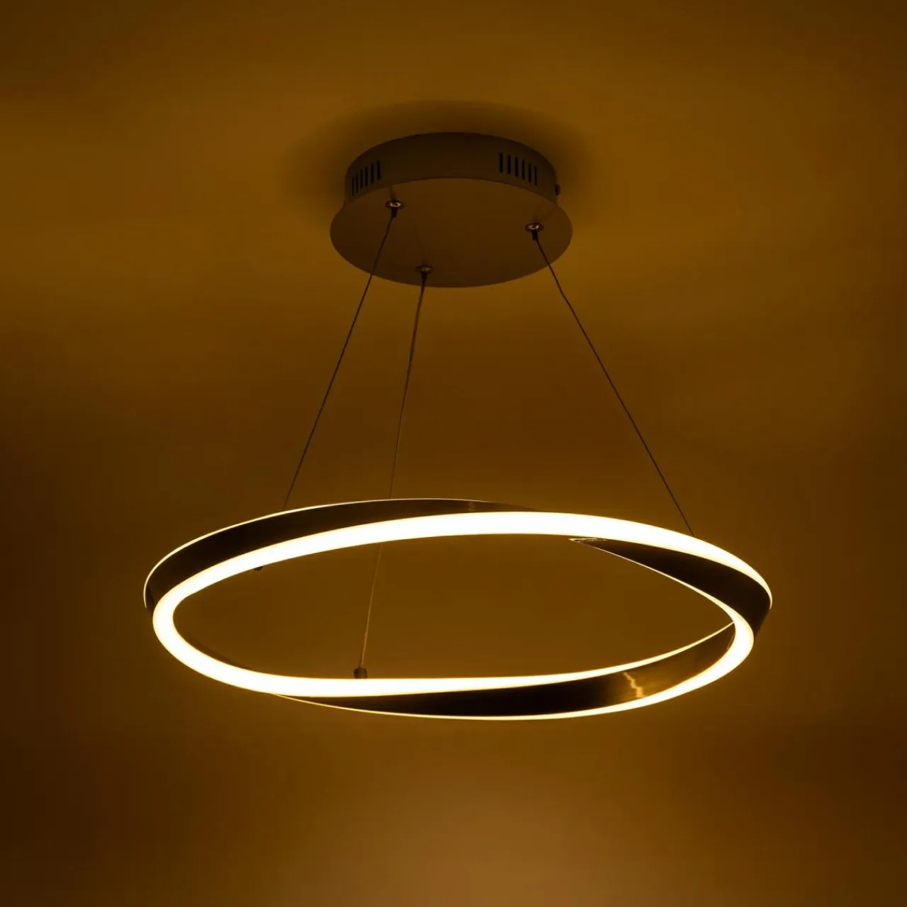 - Wykończenie wiszącej lampy GIRONA zdobi wbudowane podświetlenie LED, które wije się wokół metalowego pierścienia, przeplatając się pomiędzy jego wewnętrzną i zewnętrzną częścią.