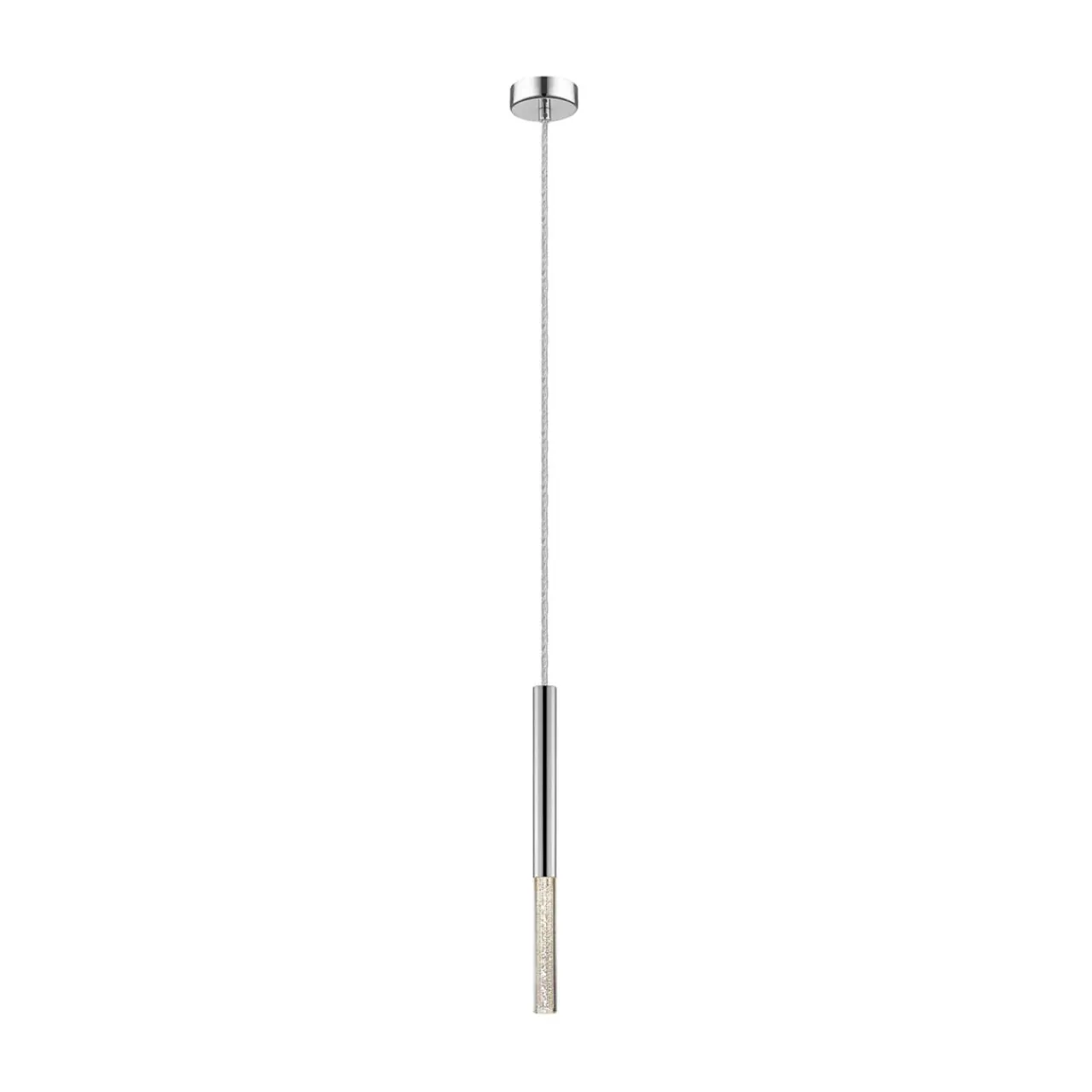 Obudowa lampy w kształcie pionowo zawieszonej tulei została wykonana z metalu i wzbogacona o akrylowe elementy. Całość wykończona w kolorze chrom optycznie rozjaśnia pomieszczenie i świetnie współgra z jasną oraz ciemną kolorystyką ścian, mebli oraz dodatków dekoracyjnych.