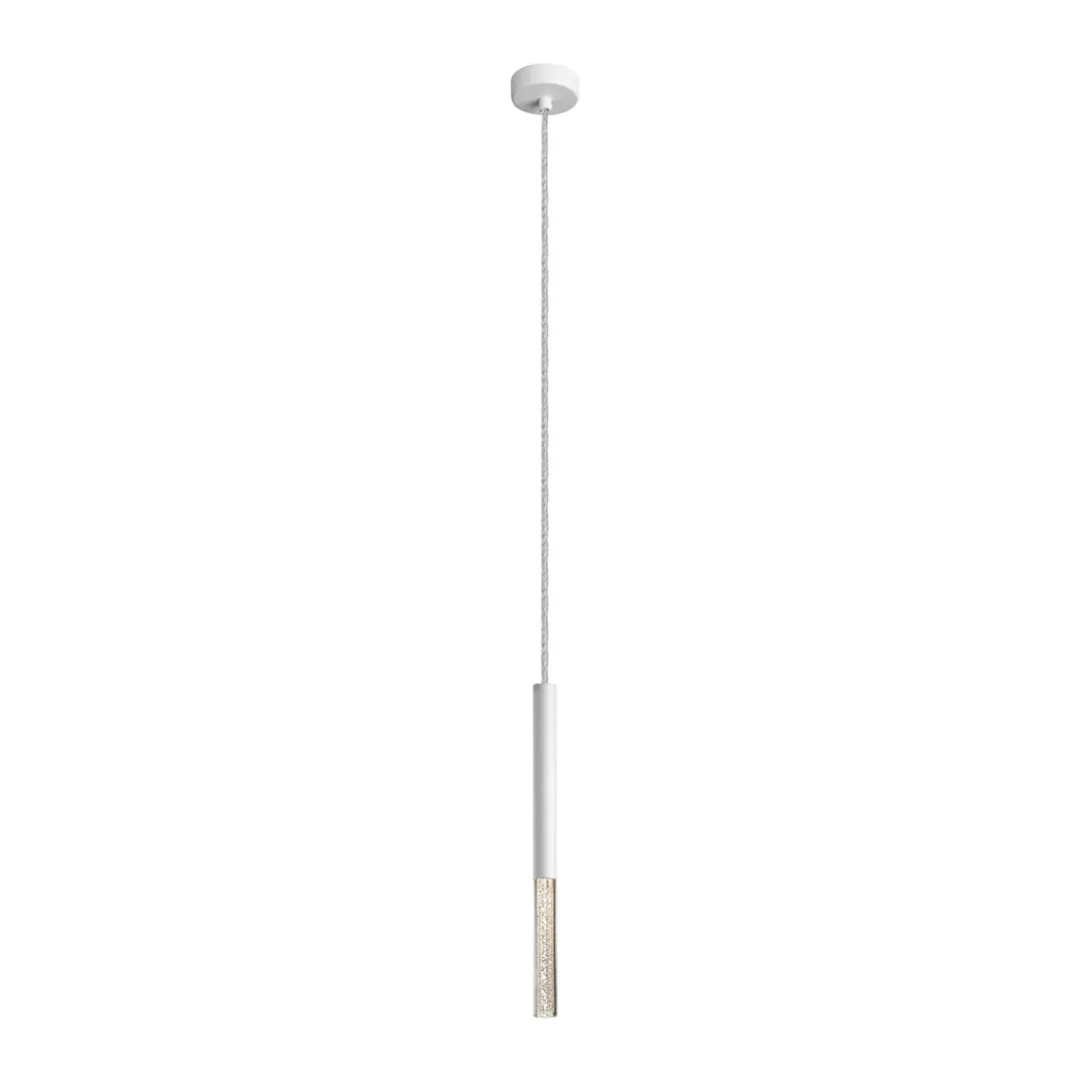 Obudowa lampy w kształcie pionowo zawieszonej tulei została wykonana z metalu i wzbogacona o akrylowe elementy. Całość wykończona białym kolorem optycznie rozjaśnia pomieszczenie i świetnie współgra z jasną kolorystyką ścian, mebli oraz dodatków dekoracyjnych.