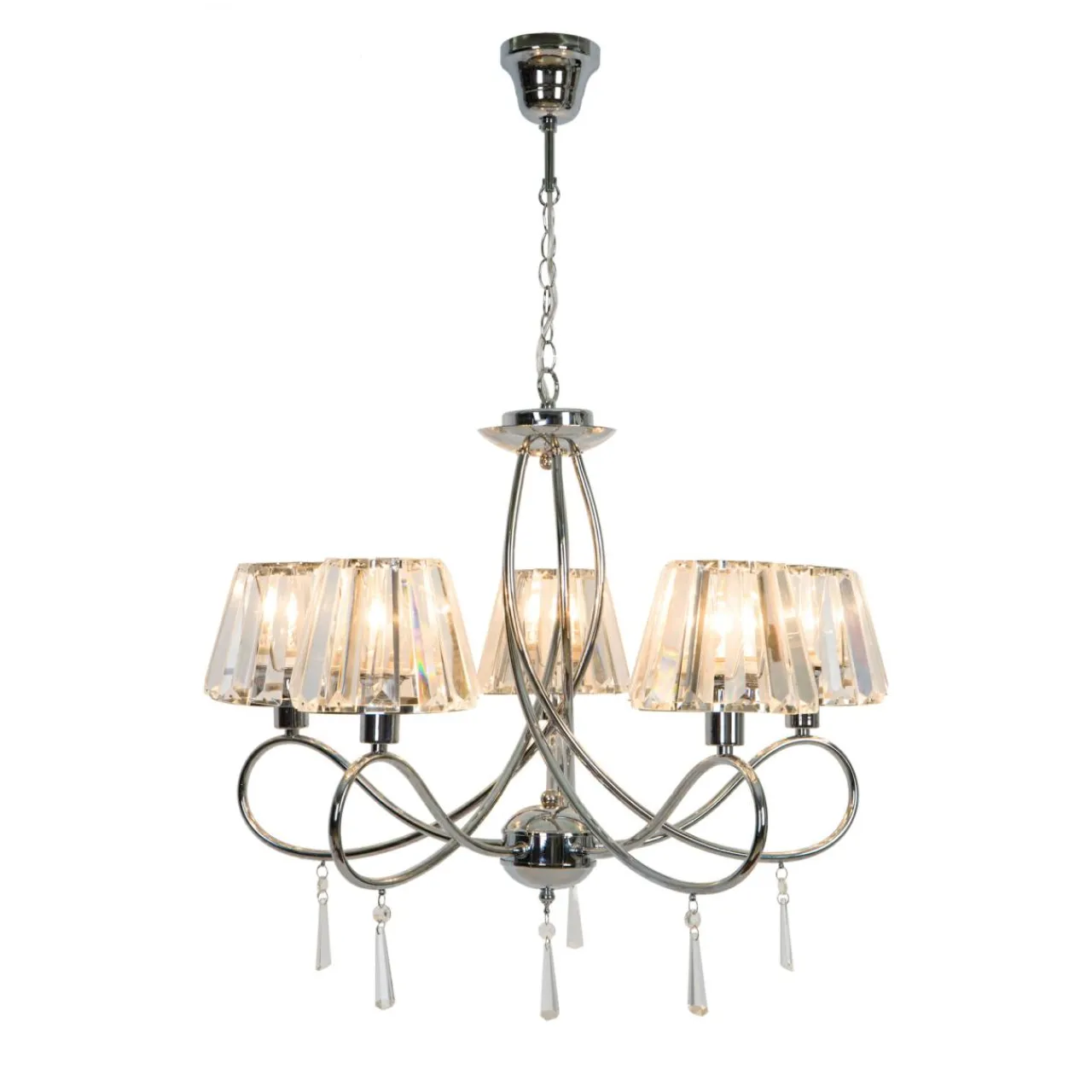 Baza lampy została wykonana z metalu, podobnie fantazyjnie wygięte ramiona. Całość wieńczą półprzejrzyste, ozdobne klosze. Po zapaleniu lampy światło ozdabia sufit i ściany urokliwymi refleksami dopełniając wystroju wnętrza pod kątem estetycznym.