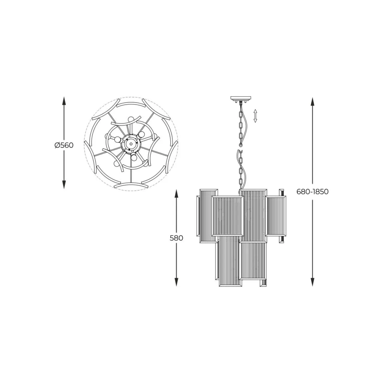 Lampa wisząca SERGIO posiada oprawę przeznaczoną dla 8 żarówek typu E14 o mocy maksymalnej 60W. Wysokość zawieszenia lampy można regulować w zakresie 70,5 – 152 cm.