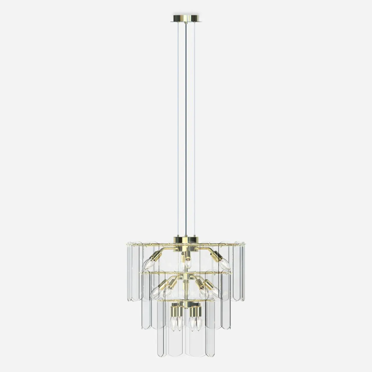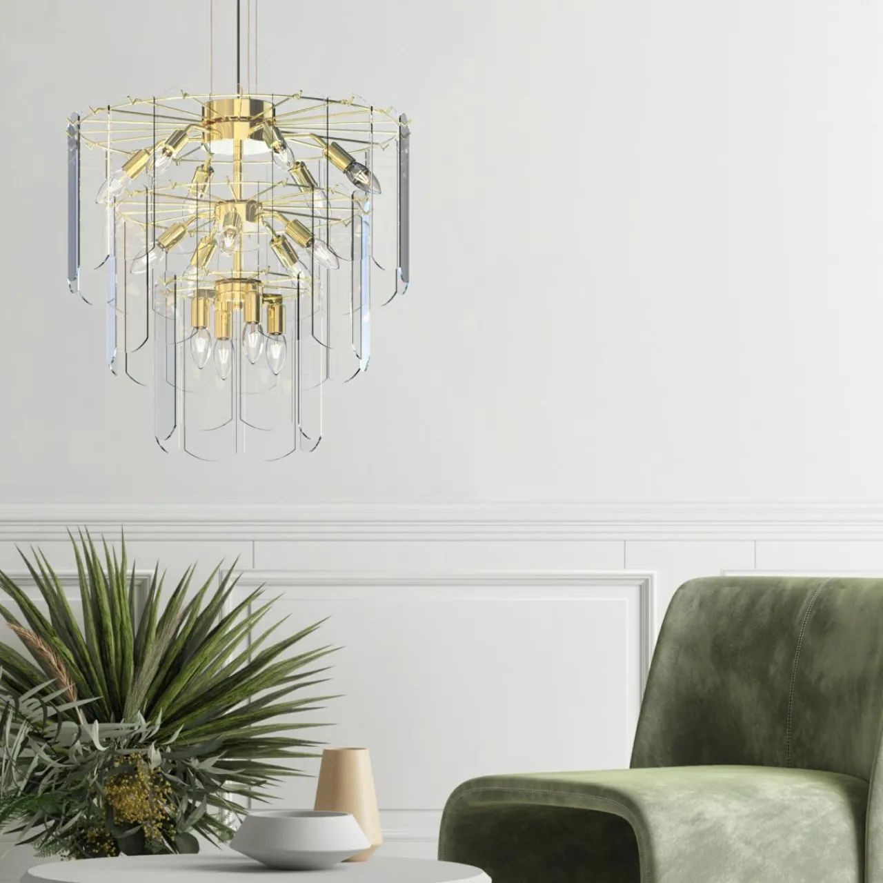 - Modny kształt lampy oparty jest ozdobach o regularnym kształcie, wykonanych z transparentnego szkła. Wykończenie lampy łączy złoto oprawy z kloszem, wewnątrz którego doskonale widać kształty 14 żarówek.