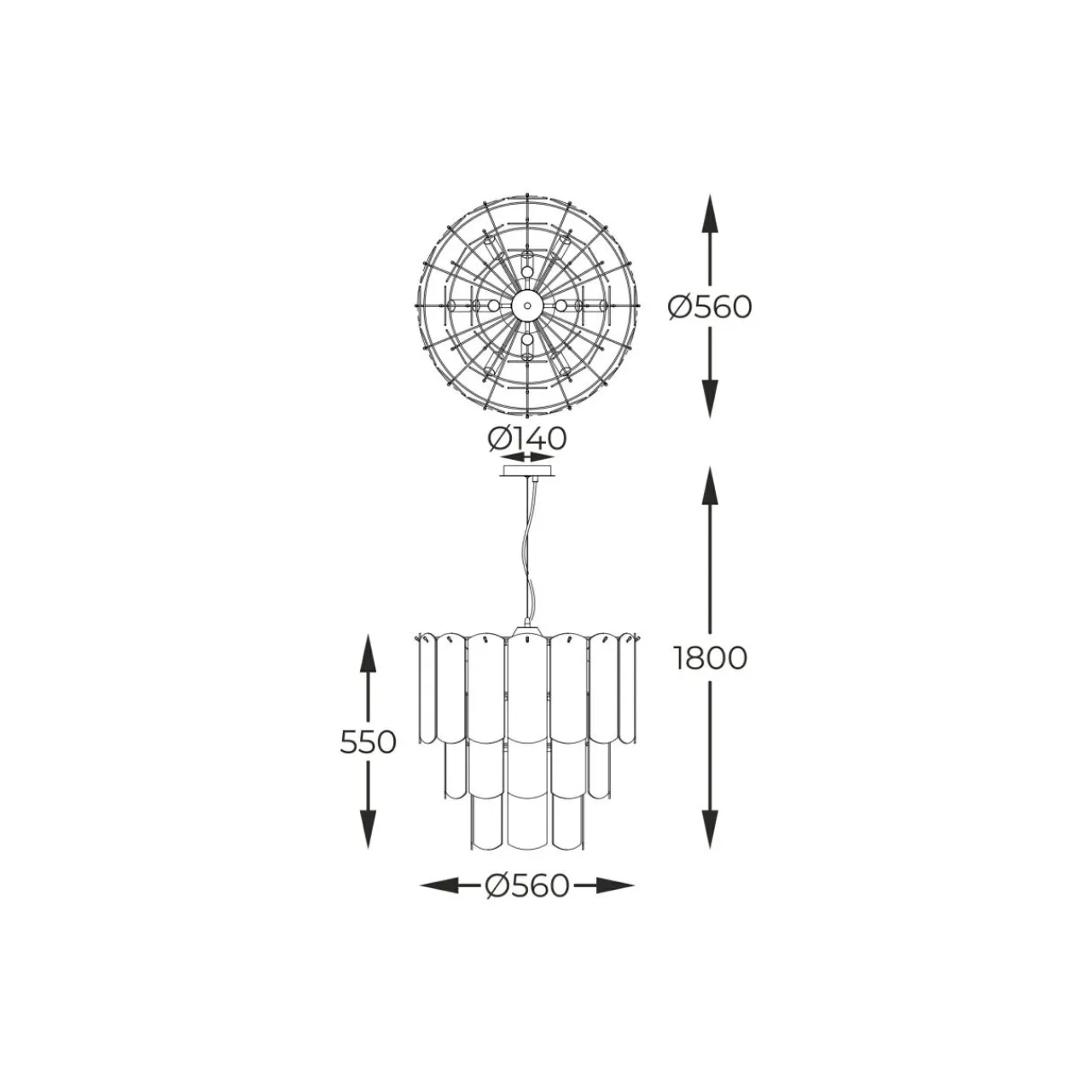 - Lampa posiada okrągłą podstawę i złoty stelaż. Jej średnica to 56 cm, w sam raz, by rozświetlić wnętrze pokoju dziennego, przestronnej sypialni lub jadalni.