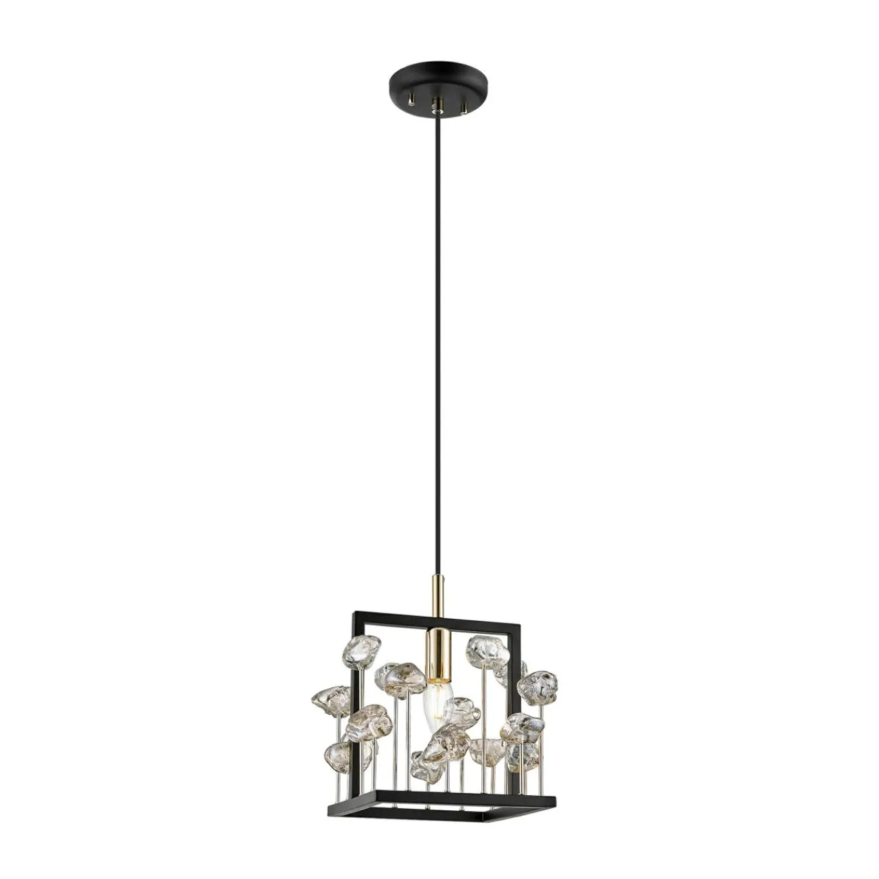 Uroda CAROLINE rozkwita po zapaleniu światła. Żarówka została umieszczona pośród szklanych, dekoracyjnych elementów, które zestawione z oszczędną, czarną oprawą lekko ją przysłaniają.