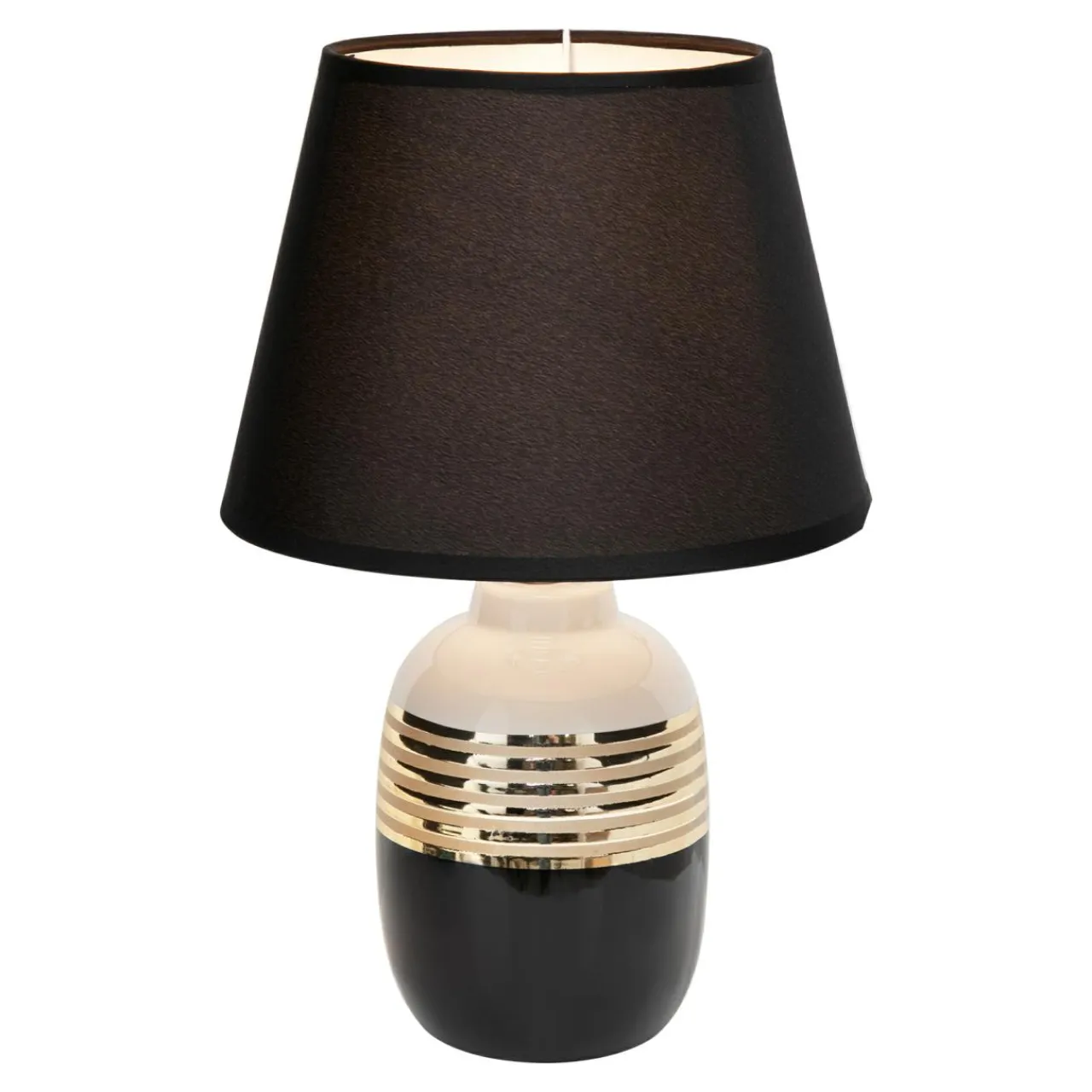 Lampa została wykonana z glinki ceramicznej, barwionej na biały i czarny kolor ze zdobieniem w kolorze złota w środkowej części podstawy. Zwieńczeniem lampy jest czarny abażur z tkaniny.