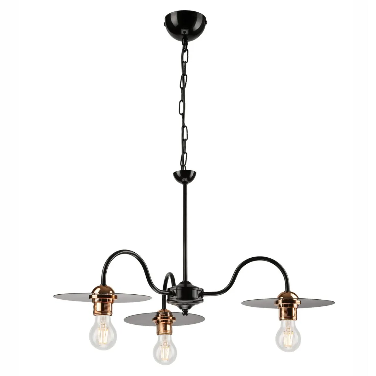 Czarne wykończenie lampy lekko błyszczy w świetle, a jednolity kolor bazy i ozdobny łańcuch podkreśla metaliczny odcień miedzi przy oprawie żarówki.