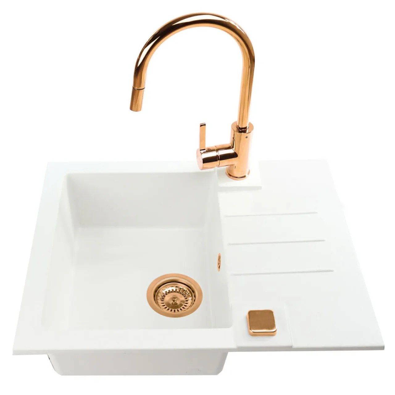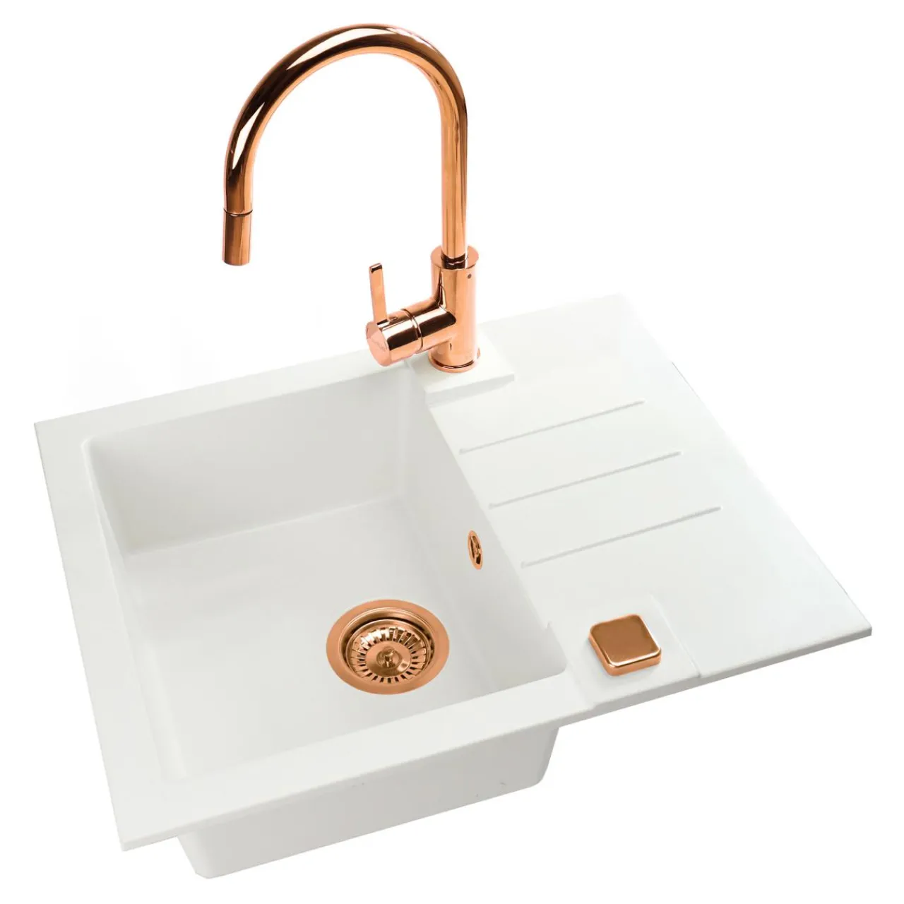 Zlewozmywak CANTO ROYAL w białym kolorze oraz specjalnie dobrana do niego bateria QUEEN o miedzianym wykończeniu zostały zaprojektowane w nowoczesnym stylu, który łączy elementy estetyczne z funkcjonalnymi.