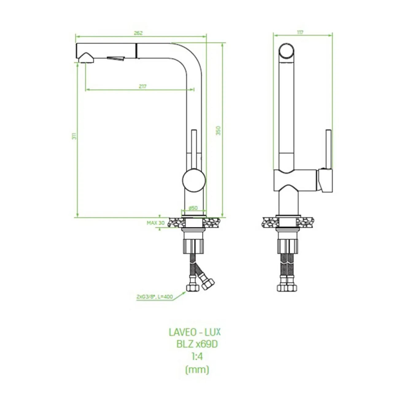 Bateria zlewozmywakowa LAVEO LUX z wyciąganą wylewką L w czarnym granitowym wykończeniu. Czarna bateria granitowa to stylowe rozwiązanie do kuchni, które doskonale pasuje do czarnych zlewozmywaków lub kontrastuje z białymi i szarymi powierzchniami.