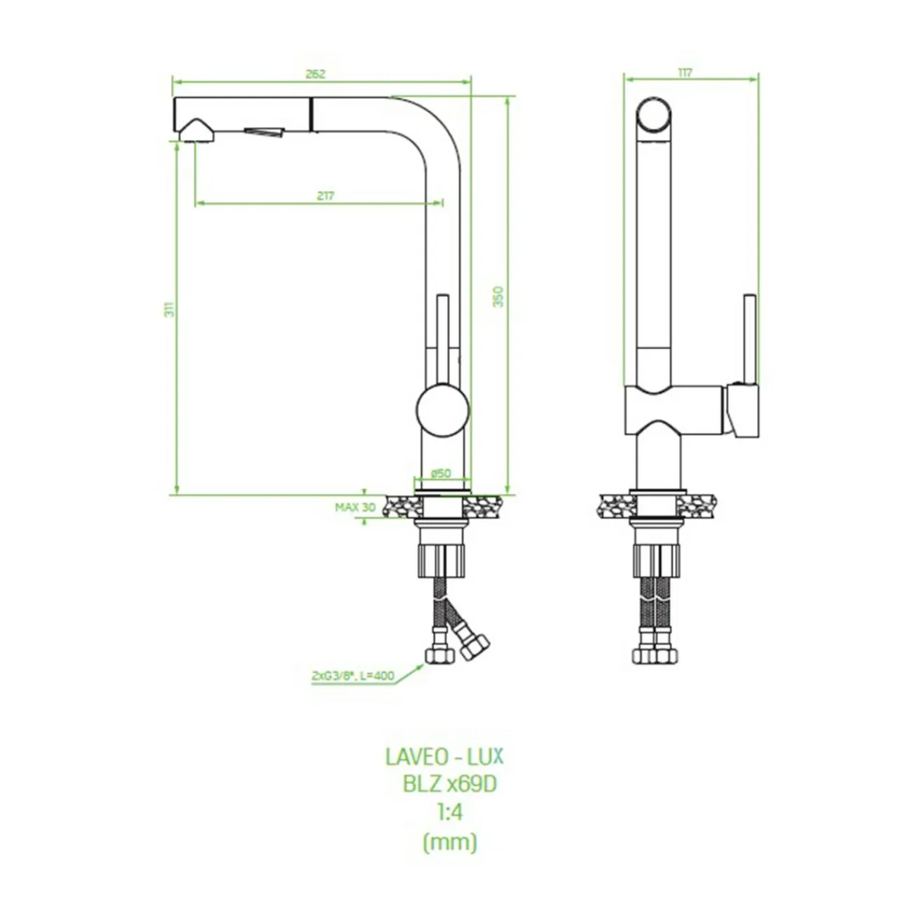 - Wyciągana wylewka L – ruchoma konstrukcja umożliwia wygodne mycie naczyń, opłukiwanie produktów spożywczych oraz łatwe napełnianie garnków.