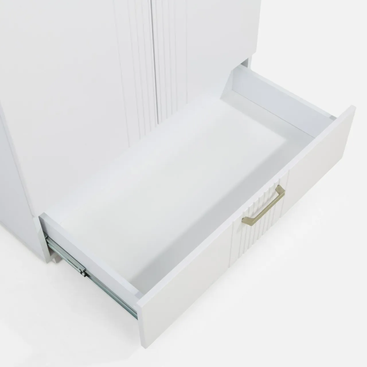 - W dolnej części szafy znajdziesz szufladę, bo dodatkowego miejsca na pościel czy bieliznę nigdy dosyć!