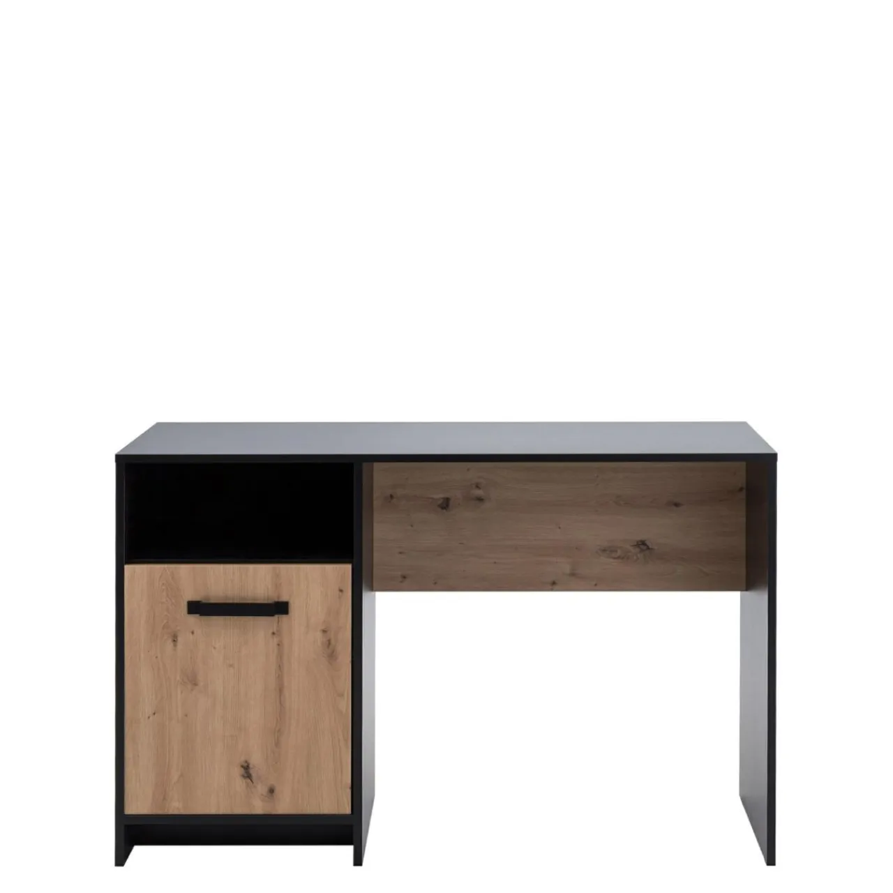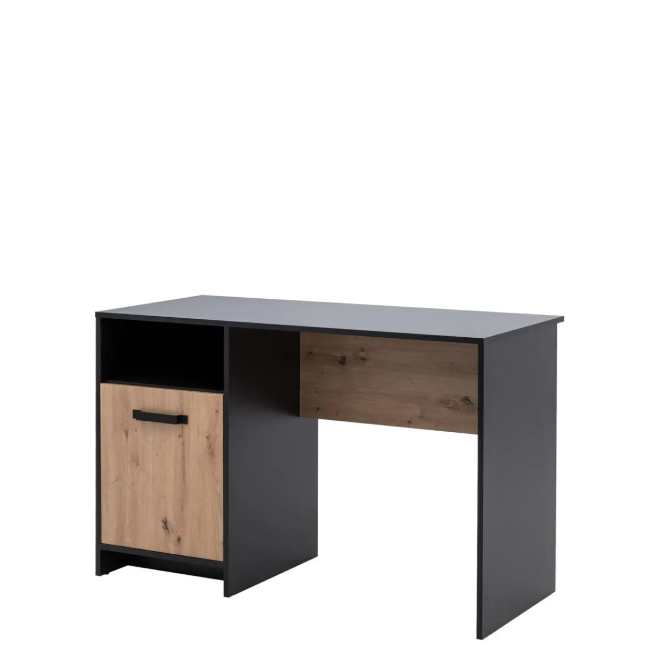 Biurko młodzieżowe STONE II wyróżnia się ciekawym designem i zapewnia wygodną przestrzeń do nauki. Otwarta wnęka i półki za drzwiami pomieszczą książki, pomoce oraz przybory szkolne.