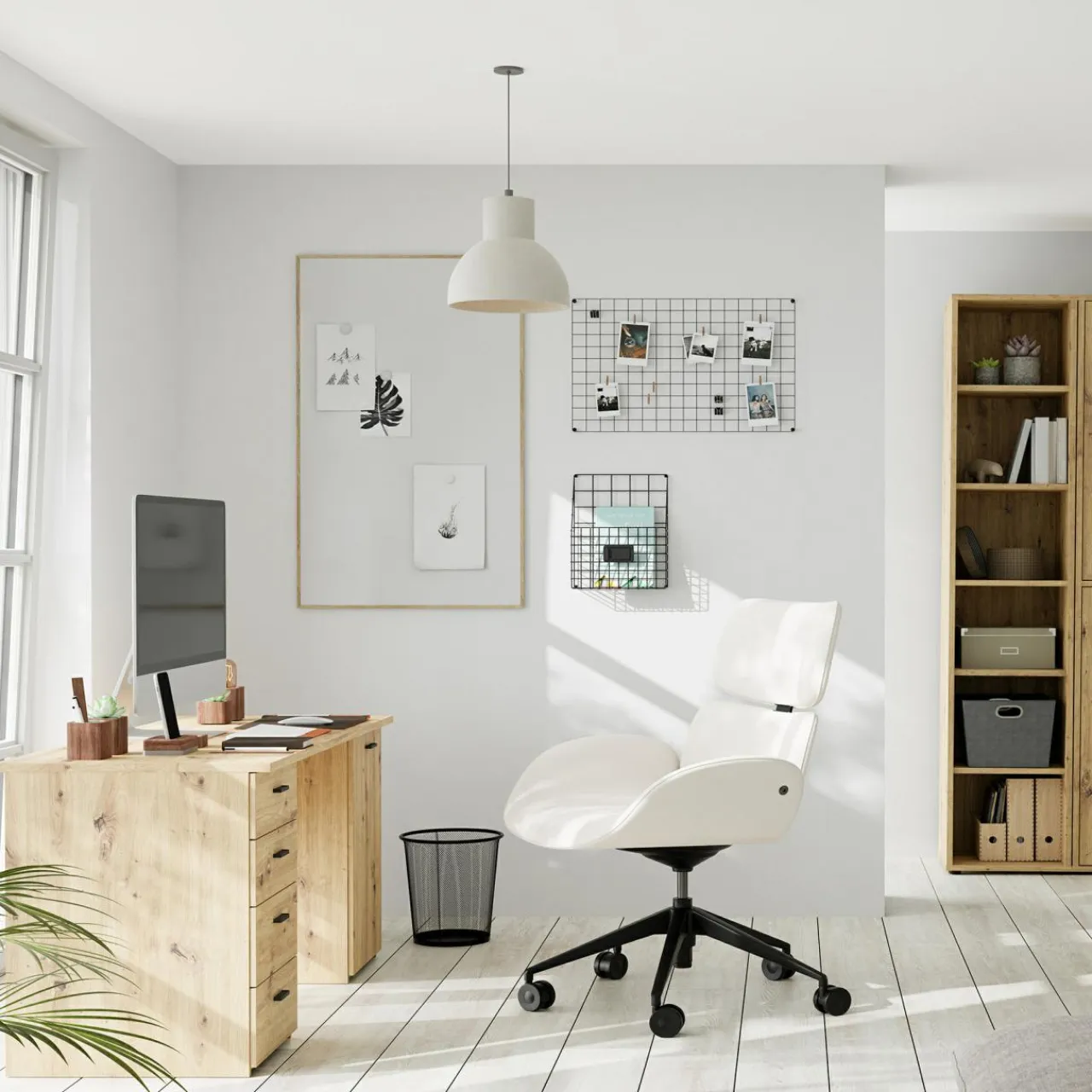 - Zabudowa tylna w wybarwieniu dębu artisan umożliwia postawienie biurka w dowolnym miejscu pomieszczenia.