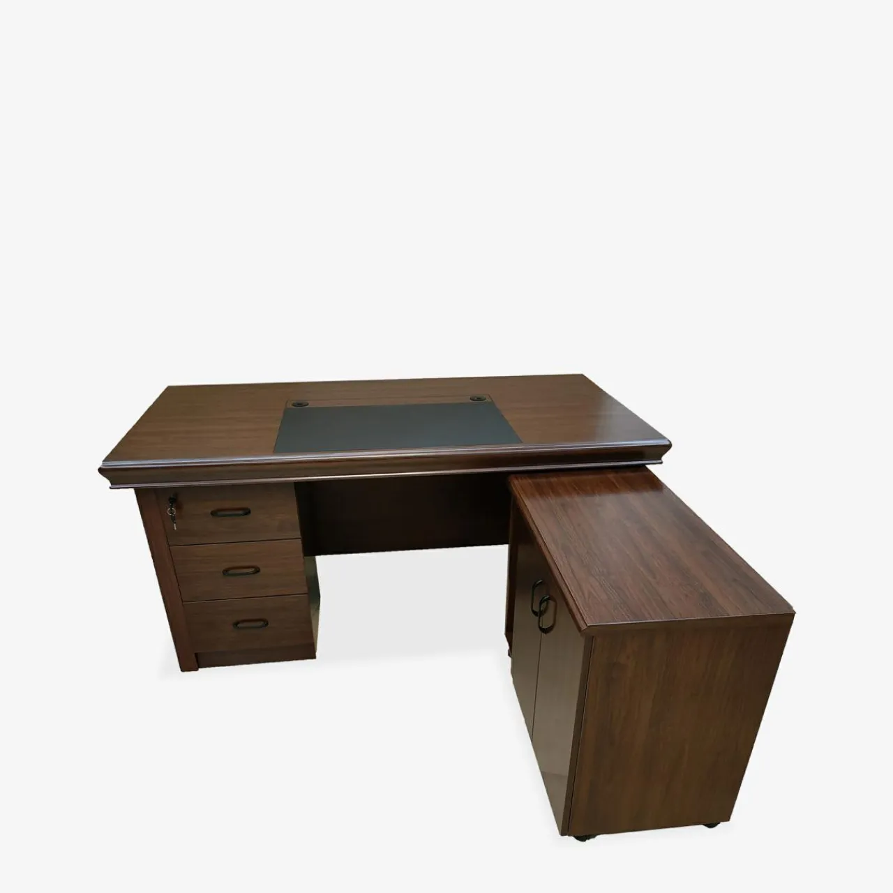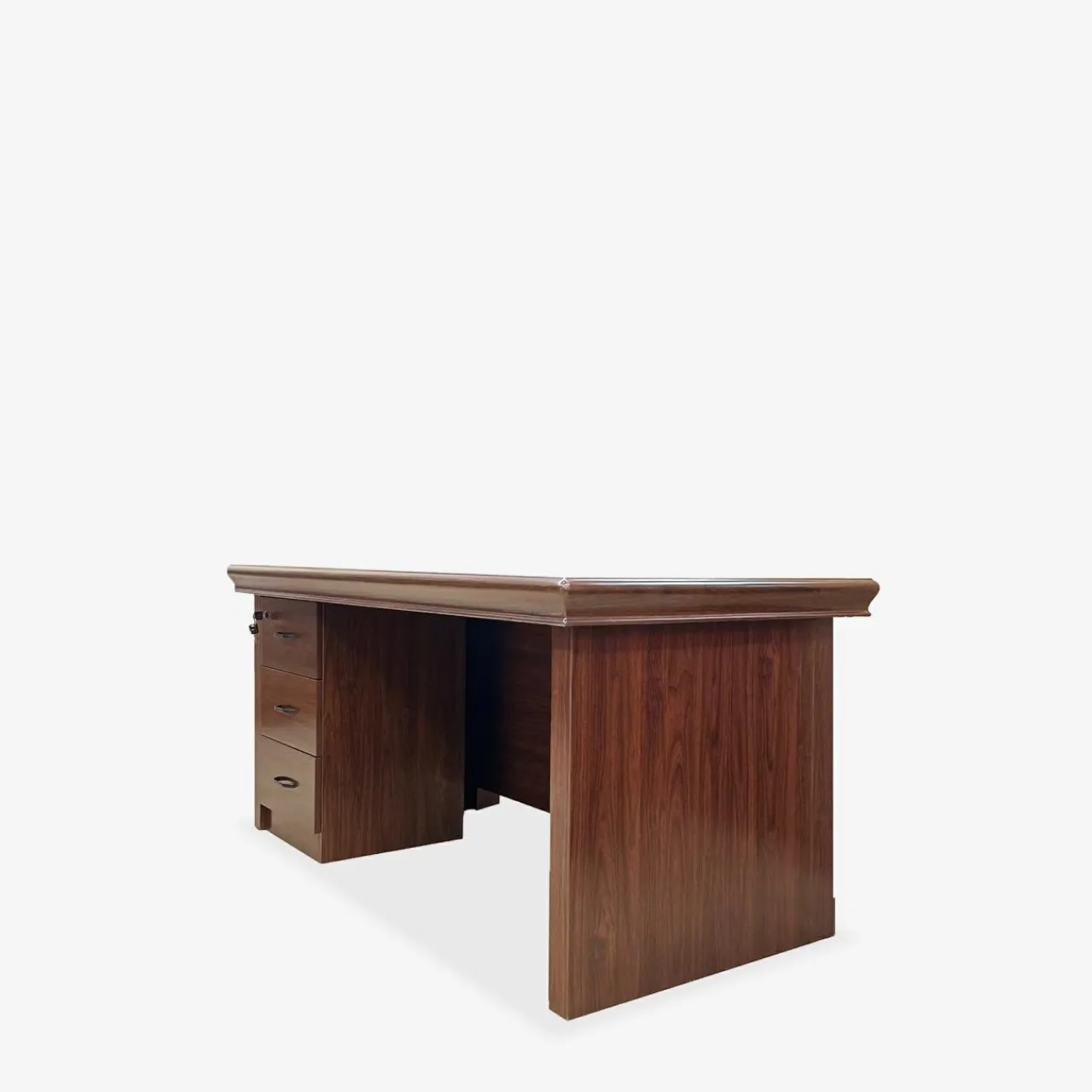 Wykończenie mebli w kolorze czerwonego orzecha prezentuje się elegancko – dzięki ciemnemu odcieniu imitacji drewna kolekcja stworzy profesjonalną i przyjazną atmosferę, idealną do prowadzenia spotkań biznesowych i konferencji. Proste linie mebli i minimalistyczne uchwyty podkreślają ich funkcjonalność.