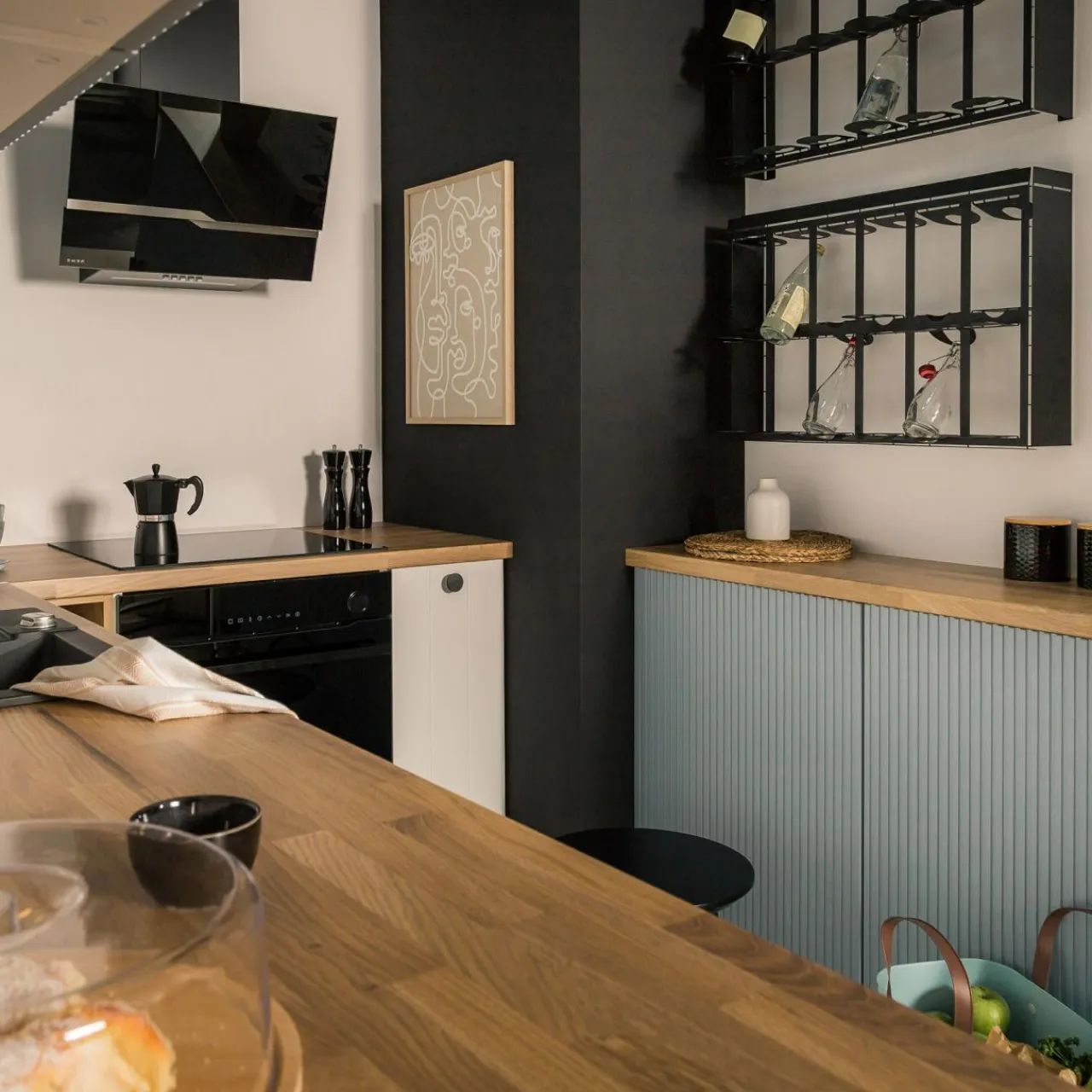 Jego boczne krawędzie są w kolorze okleiny, natomiast tył jest biały, co umożliwia jego idealne dopasowanie do kuchni w układzie liniowym oraz narożnym. Posiada wysoką odporność na uszkodzenia mechaniczne i wilgoć. Jego zaletą jest również łatwość czyszczenia oraz wysoka odporność na ścieranie.