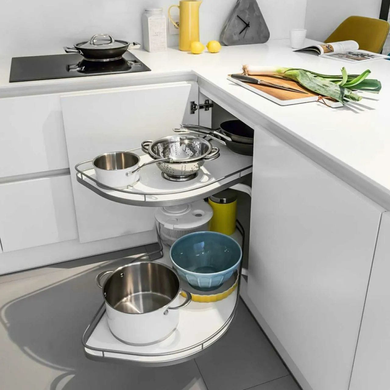 Wysuwane, pionowe szuflady, ruchome koszyki, czy półki montowane w szafkach narożnych pozwalają w intuicyjny sposób wykorzystać przestrzeń i skutecznie zarządzać nią. Wszystko jest w zasięgu wzroku i ręki bez konieczności przestawiania wielu produktów lub przetrząsania wnętrza szafki w poszukiwaniu jednej, określonej rzeczy.