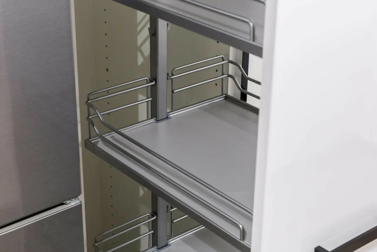 Wysuwane, pionowe szuflady, ruchome koszyki, czy półki montowane w szafkach narożnych pozwalają w intuicyjny sposób wykorzystać przestrzeń i skutecznie zarządzać nią. Wszystko jest w zasięgu wzroku i ręki bez konieczności przestawiania wielu produktów lub przetrząsania wnętrza szafki w poszukiwaniu jednej, określonej rzeczy.