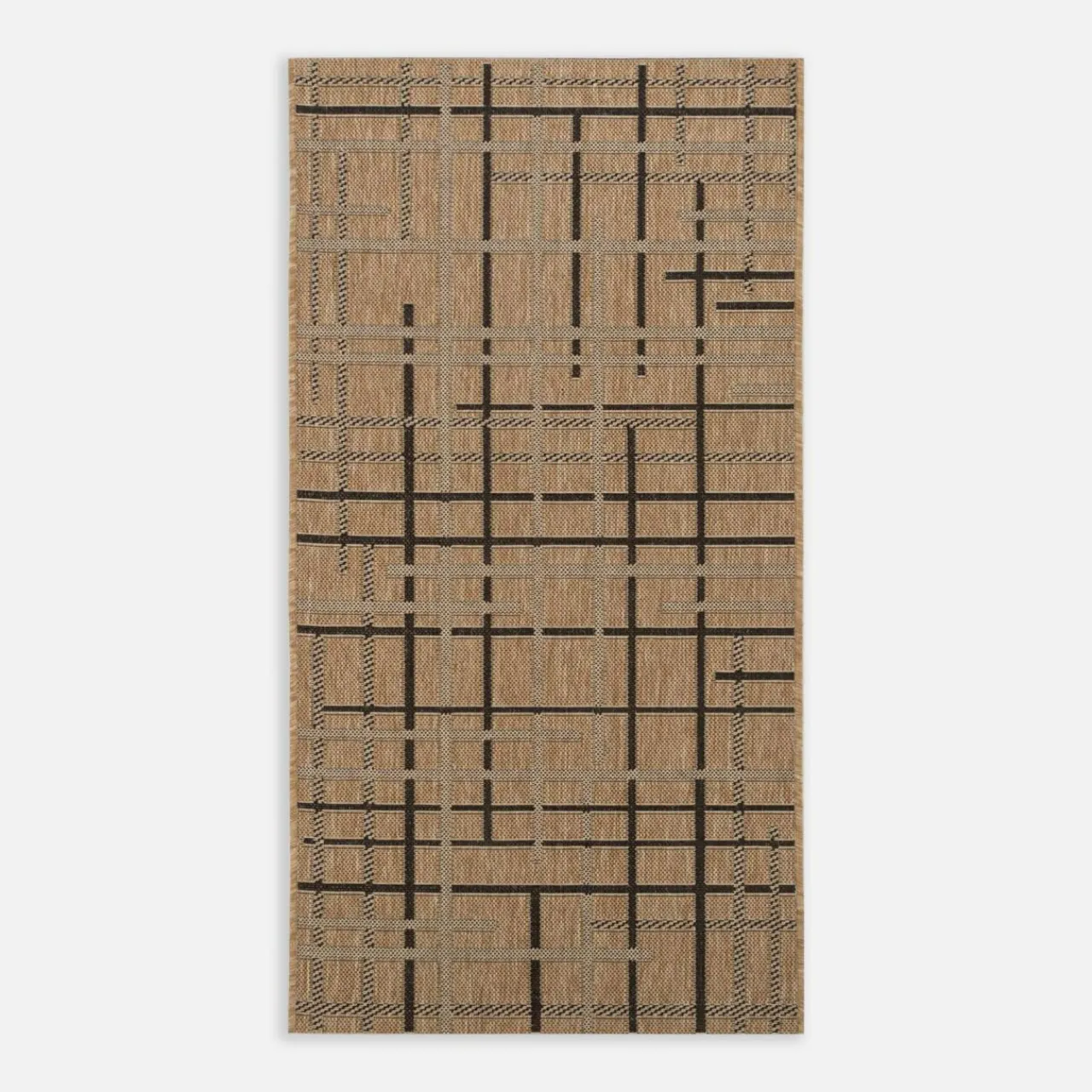 Dywan JUTA to stylowy dodatek, który przyciąga uwagę nowoczesnym wzornictwem. Połączenie ciemnej bazy z jasnymi, przecinającymi się liniami nadaje wnętrzu wyrazistości.