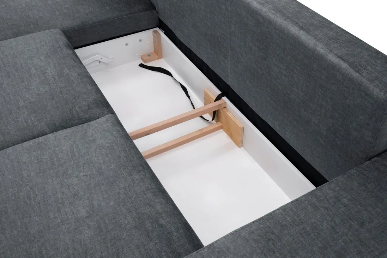 - W środku siedziska znajduje się pojemnik na pościel, do którego możesz schować poduszkę i kołdrę.