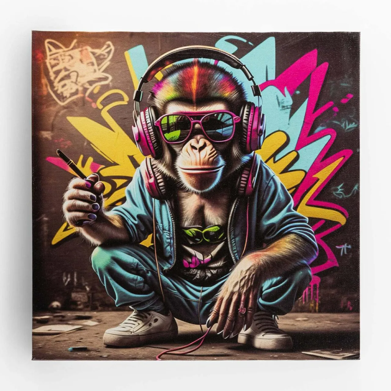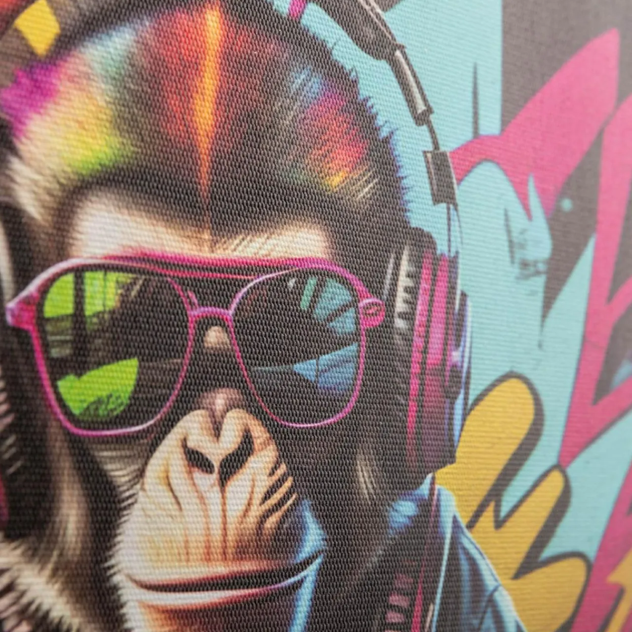 - Małpa w słuchawkach i okularach trafi w gust miłośnika muzyki i kolorowych dekoracji.