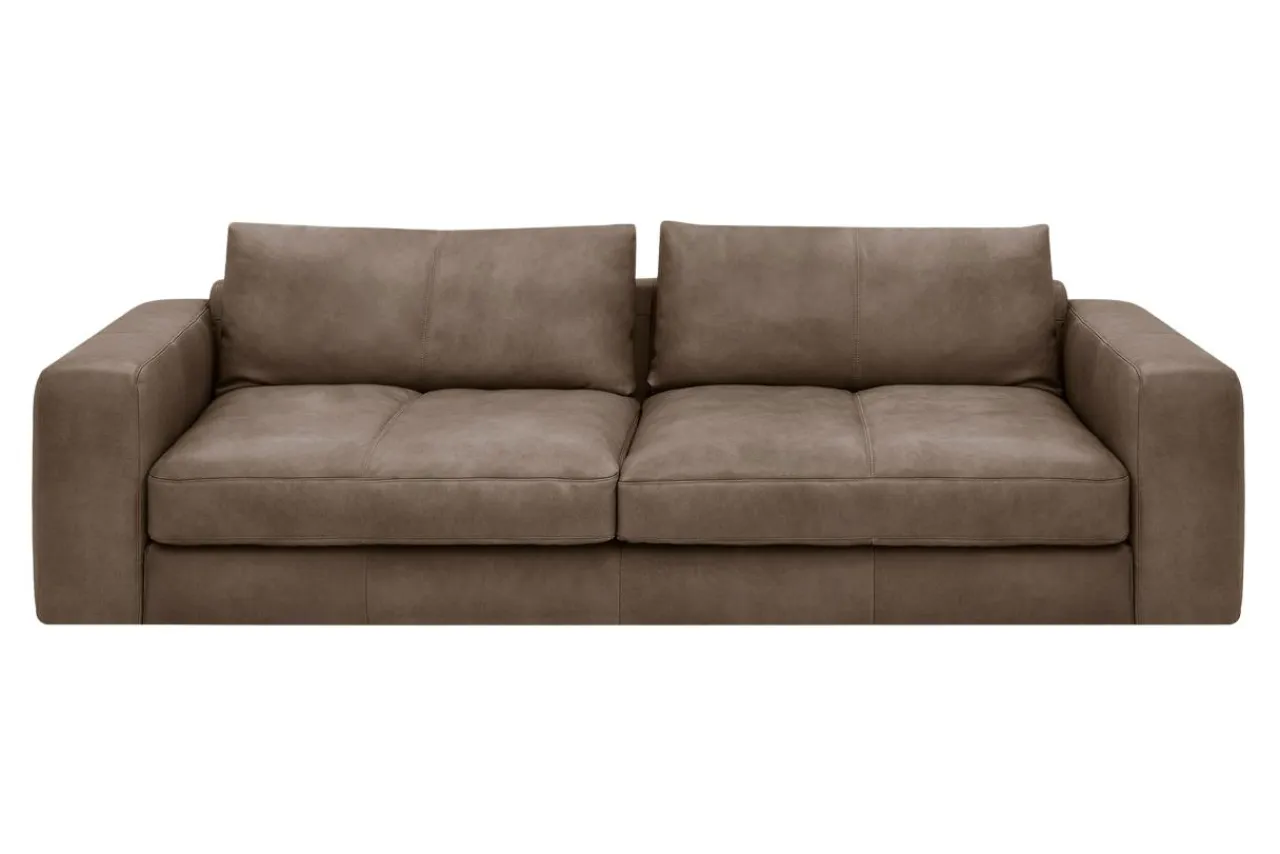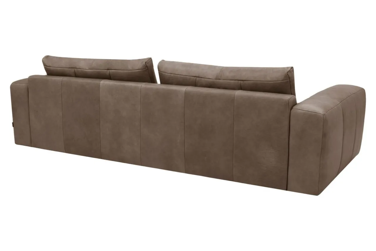 Skóra użyta do tapicerowania sofy jest naturalna w ciemnym, brązowym odcieniu.