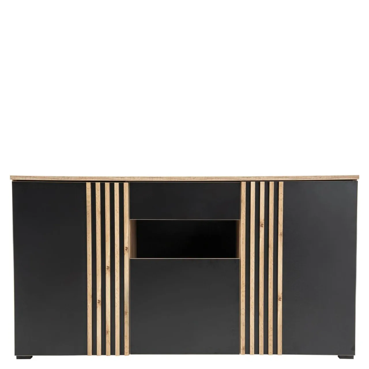 - Ciepły kolor dębu wotan, czarne, minimalistyczne fronty bez uchwytów i ozdobne lamele – całość prezentuje się elegancko i sprawi, że Twój salon wypełni współczesny design.