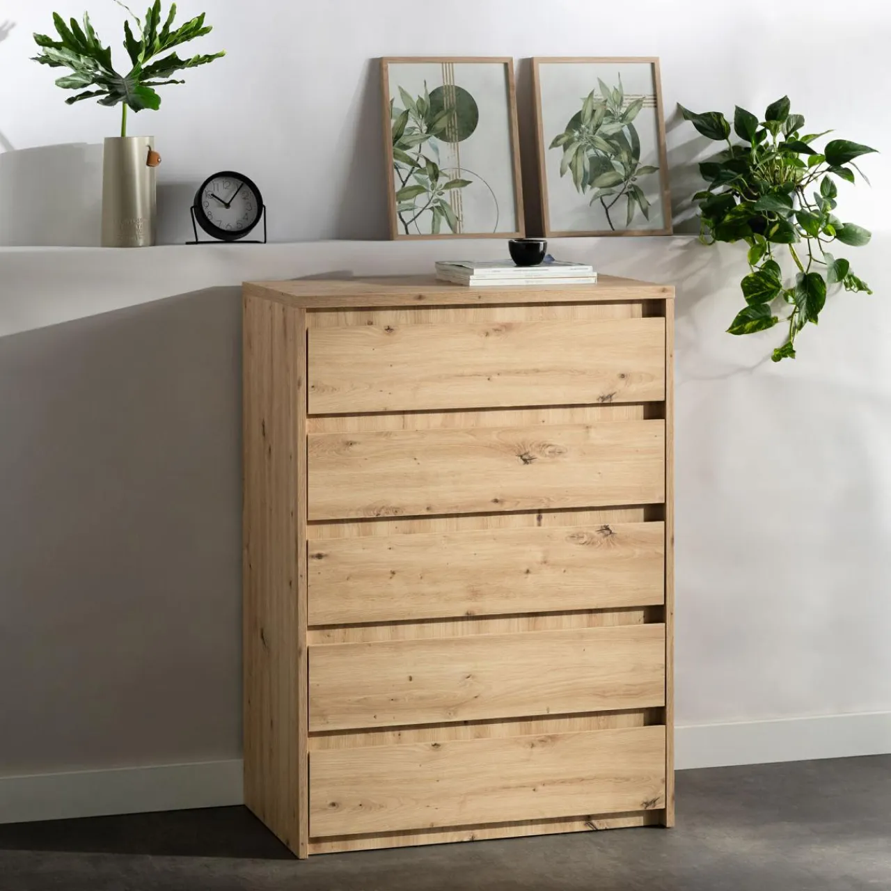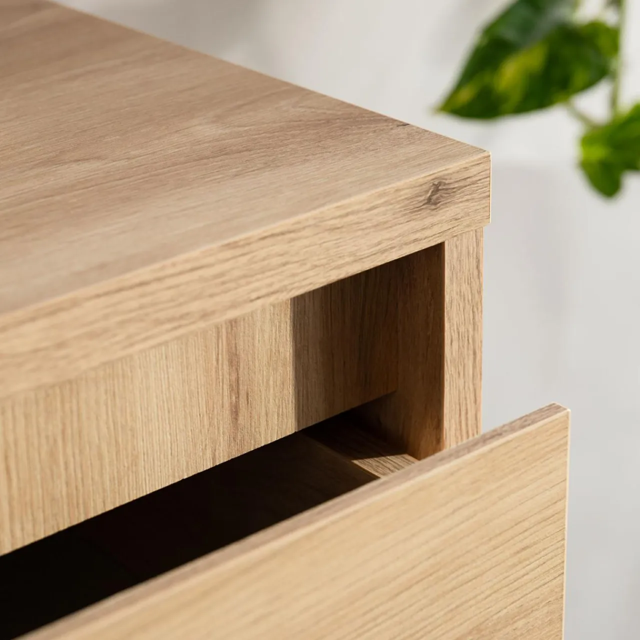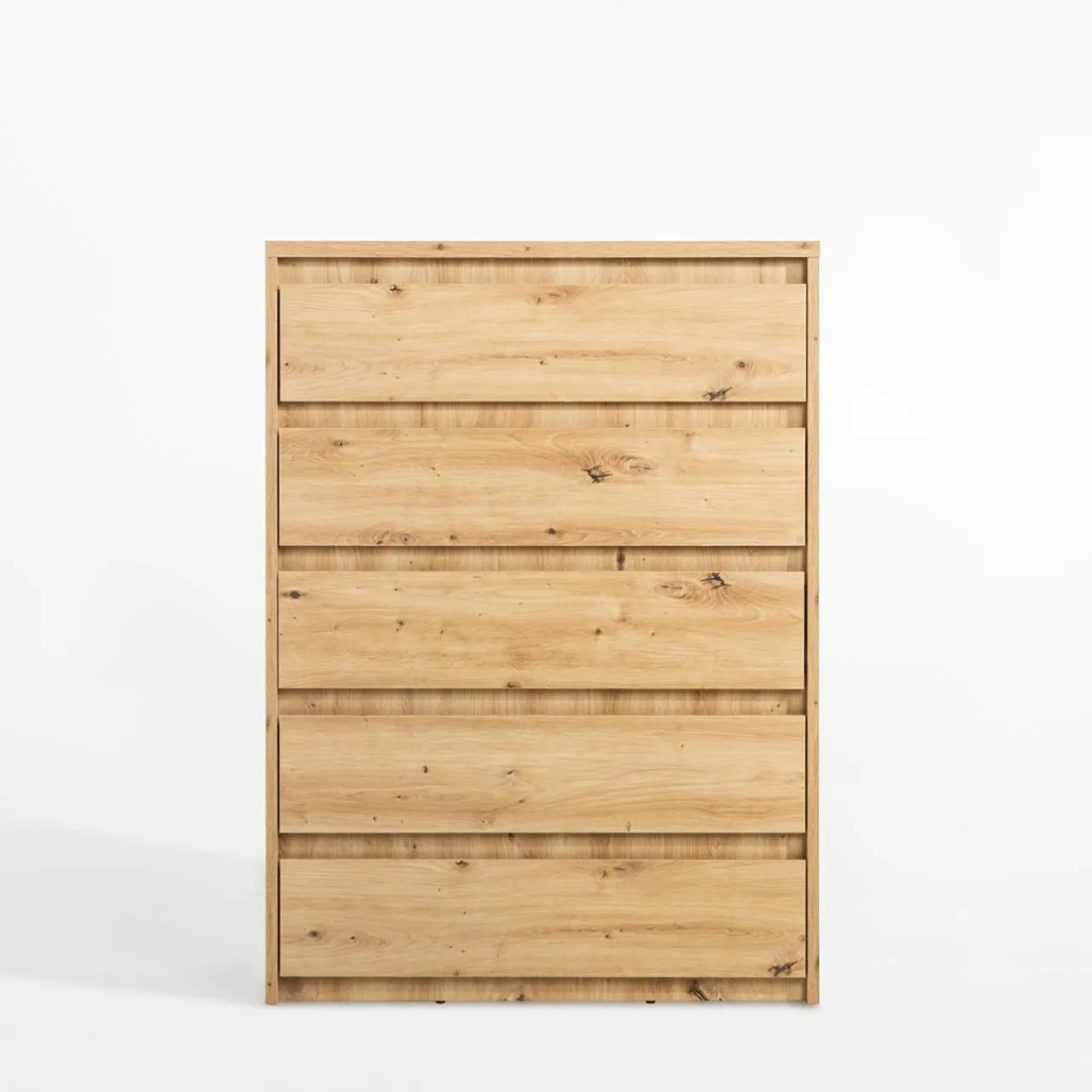- Komoda wykonana jest z laminowanej płyty meblowej o grubości 1.8 cm w kolorze dąb artisan.