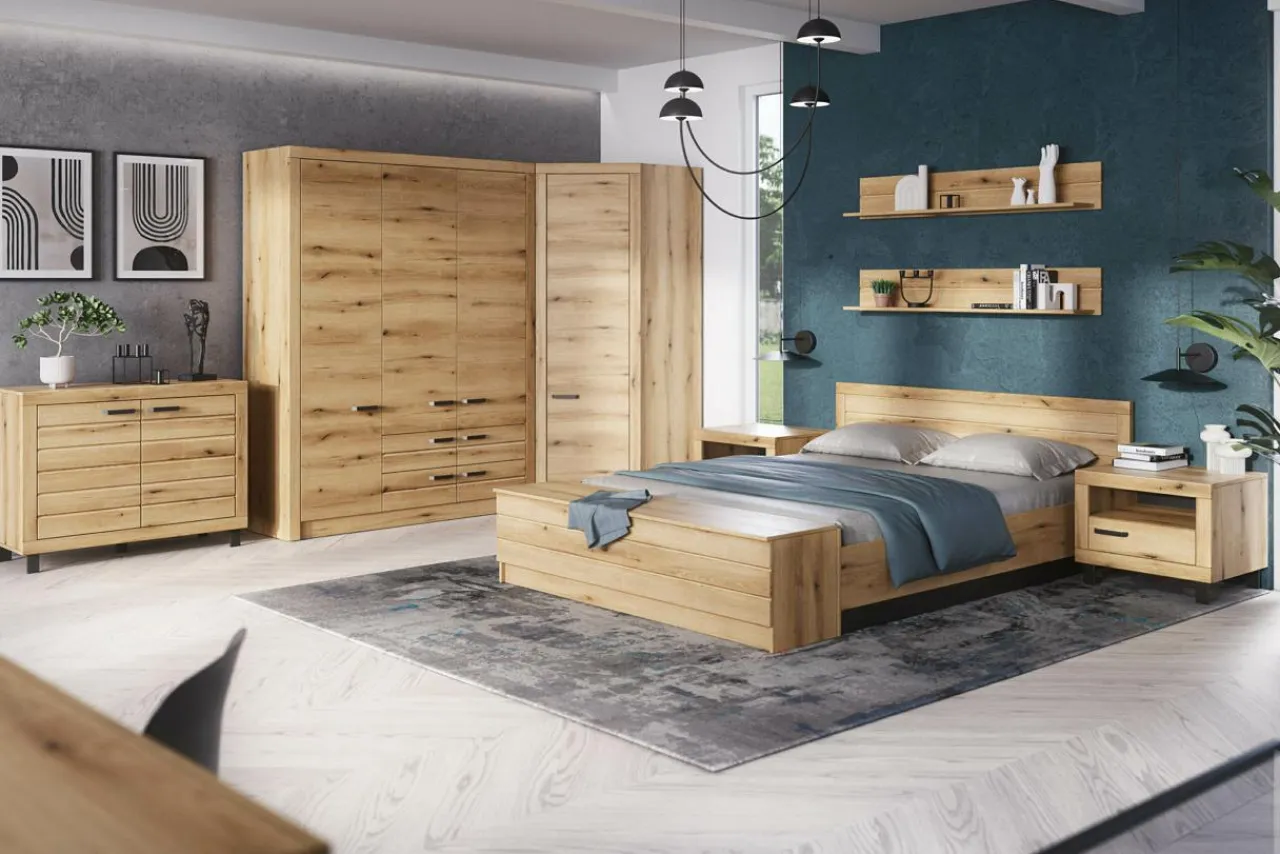 - Minimalistyczna forma oraz poziome żłobienia w wezgłowiu w kolorze jasnego, sękatego drewna pozwolą Ci na stworzenie przestronnej i przytulnej sypialni.